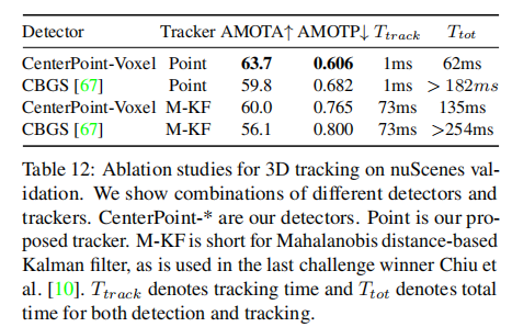 表 12 显示,CenterPoint 的速度基中心点匹配跟踪显著优于卡尔曼滤波: