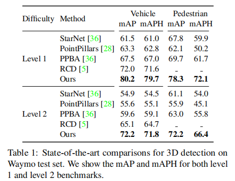 表 1 展示 Waymo 测试集上的 3D 检测结果,CenterPoint 在 Level 2(仅含 1 个激光雷达点的目标)场景中表现突出: