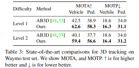 - Waymo 测试集(表 3):Level 2 场景中,车辆 MOTA 59.4(超 AB3D 19.3%),行人 MOTA 56.6(超 AB3D 18.9%);