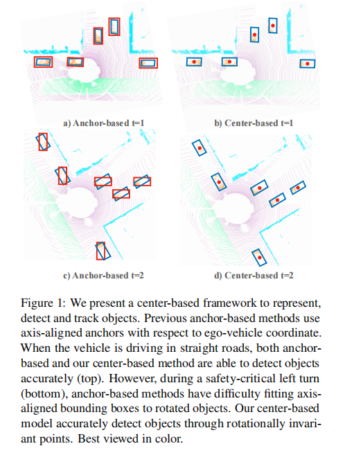 注:上图展示直道行驶(上)与左转(下)场景的检测效果。Anchor-based 方法在目标旋转时难以适配轴对齐框,而 CenterPoint 通过旋转不变的中心点实现精准检测。