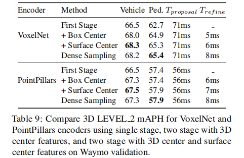 - 相比 PV-RCNN 的密集采样(6×6 点),CenterPoint 的 5 个关键位置采样性能相当,但速度更快。