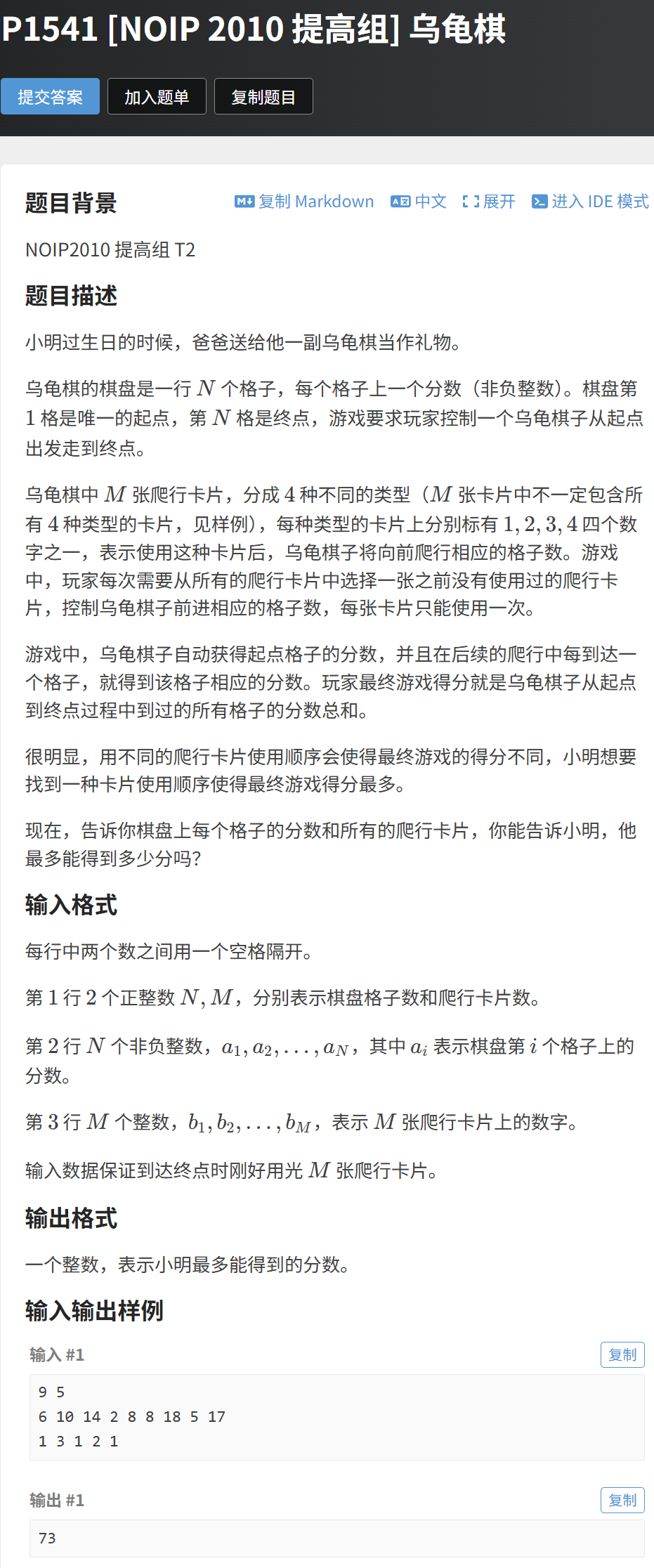 乌龟棋的棋盘有 N 个格子,每个格子有分数。玩家有 M 张爬行卡片,分为 4 种类型(1、2、3、4),每张卡片只能用一次。乌龟从第 1 格出发,用完全部卡片到达第 N 格,求最大得分。