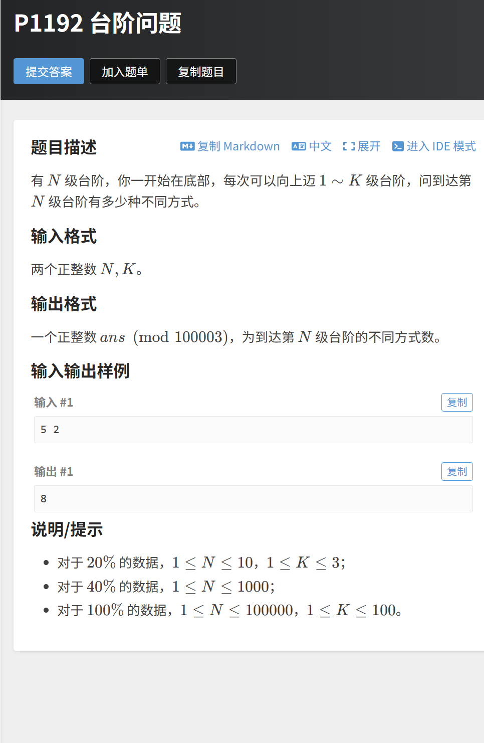 例题 1:台阶问题(洛谷 P1192)------ 一维线性 DP 入门