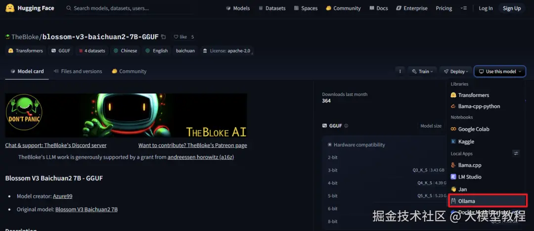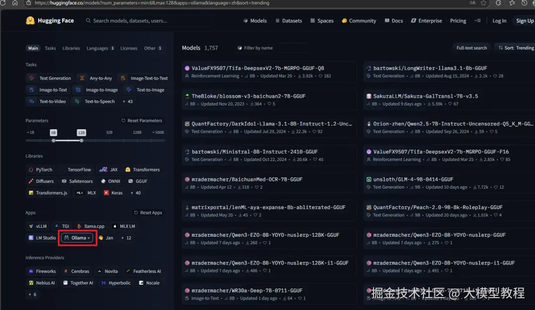 HuggingFace 网址:huggingface.co/models,我们只需在筛选条件添加 Ollama 然后查找模型
