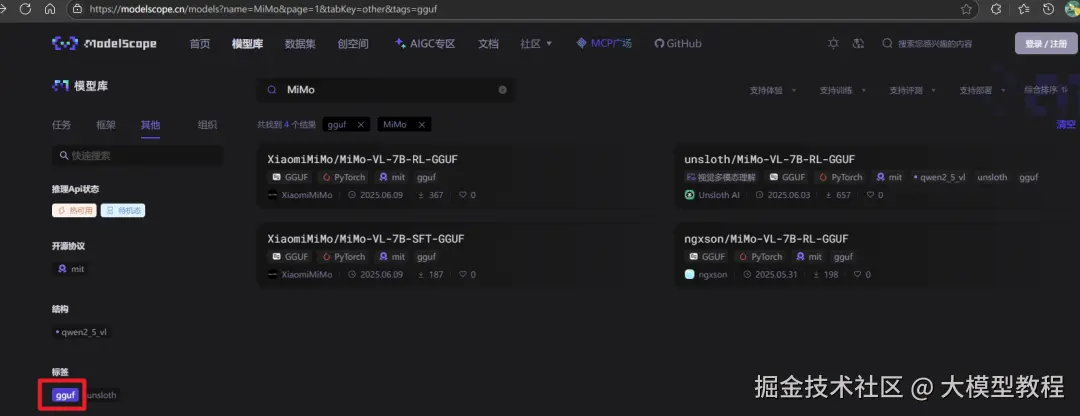 有些大模型并未上架 ollama,例如小米开源的 MiMo,如果我们想使用该模型,可以从 魔塔社区、HuggingFace 等大模型社区搜索并下载