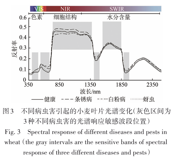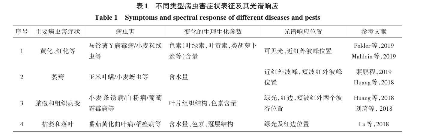 可以发现,不同的作物病虫害由于致病病原体种类、害虫本身食性和取食方式等的不同,其与寄主作物之间的相互作用过程不同,就导致了寄主植被间不同的生理和生物化学变化。这些不同的病虫害症状表征构成了高光谱技术进行作物病虫害识别监测的基础