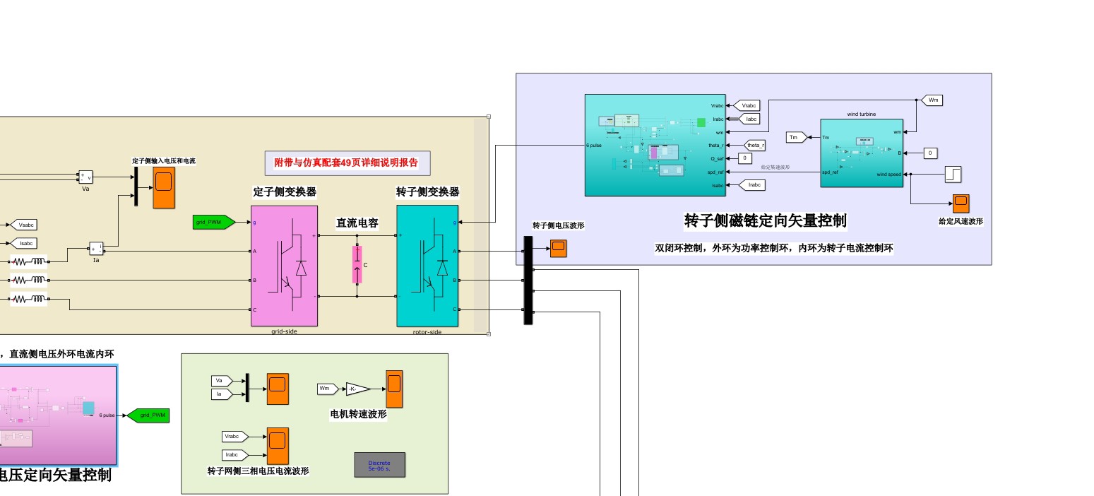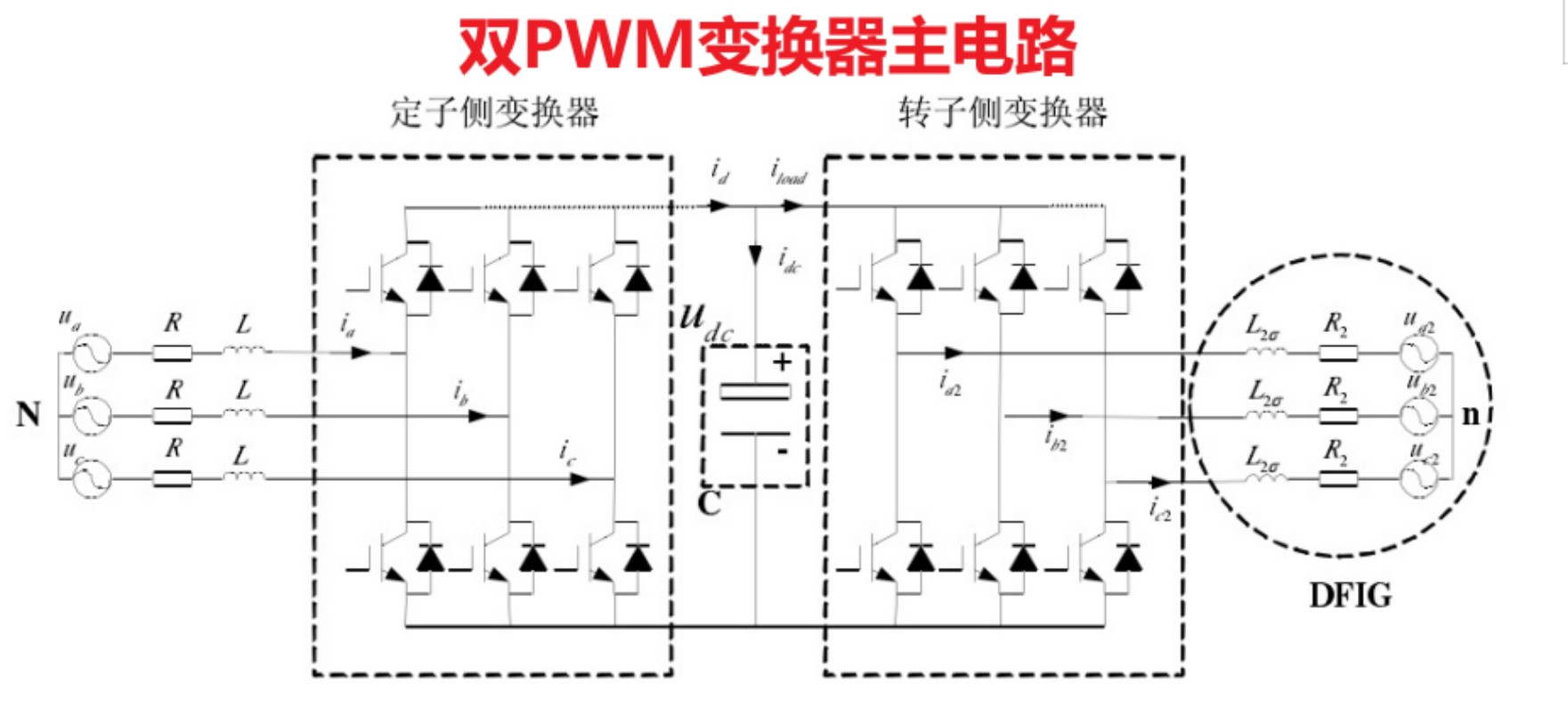双馈风机的转子绕组通过变流器与电网相连,这玩意儿玩的就是矢量控制的精髓。定子侧和转子侧两个变流器各自带着双闭环控制,Matlab里搭模型的时候最怕参数整定搞崩------别问我怎么知道的。