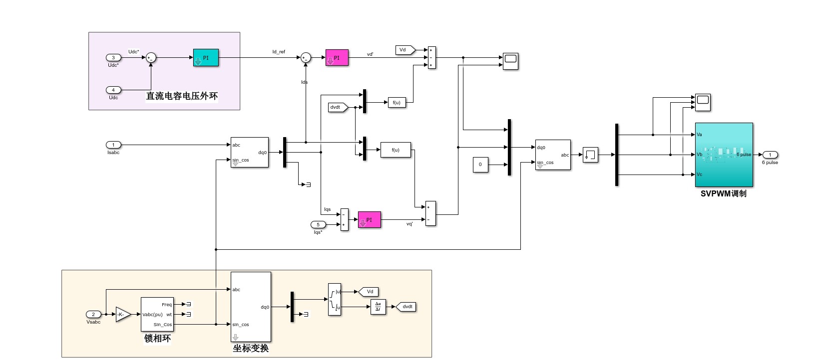 内环电流控制必须处理转差频率带来的耦合。SVPWM模块直接用Simulink自带的Space Vector Generator,但要注意死区时间设置。某次忘了设2us的死区,IGBT直接表演烟花秀。