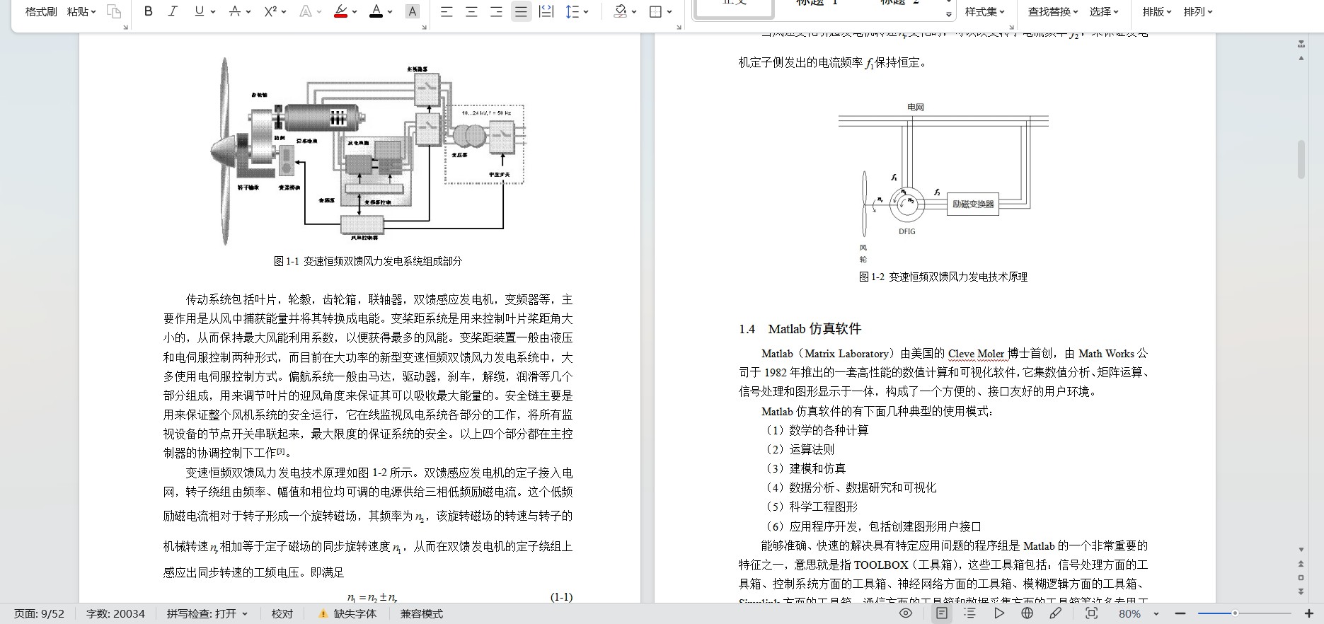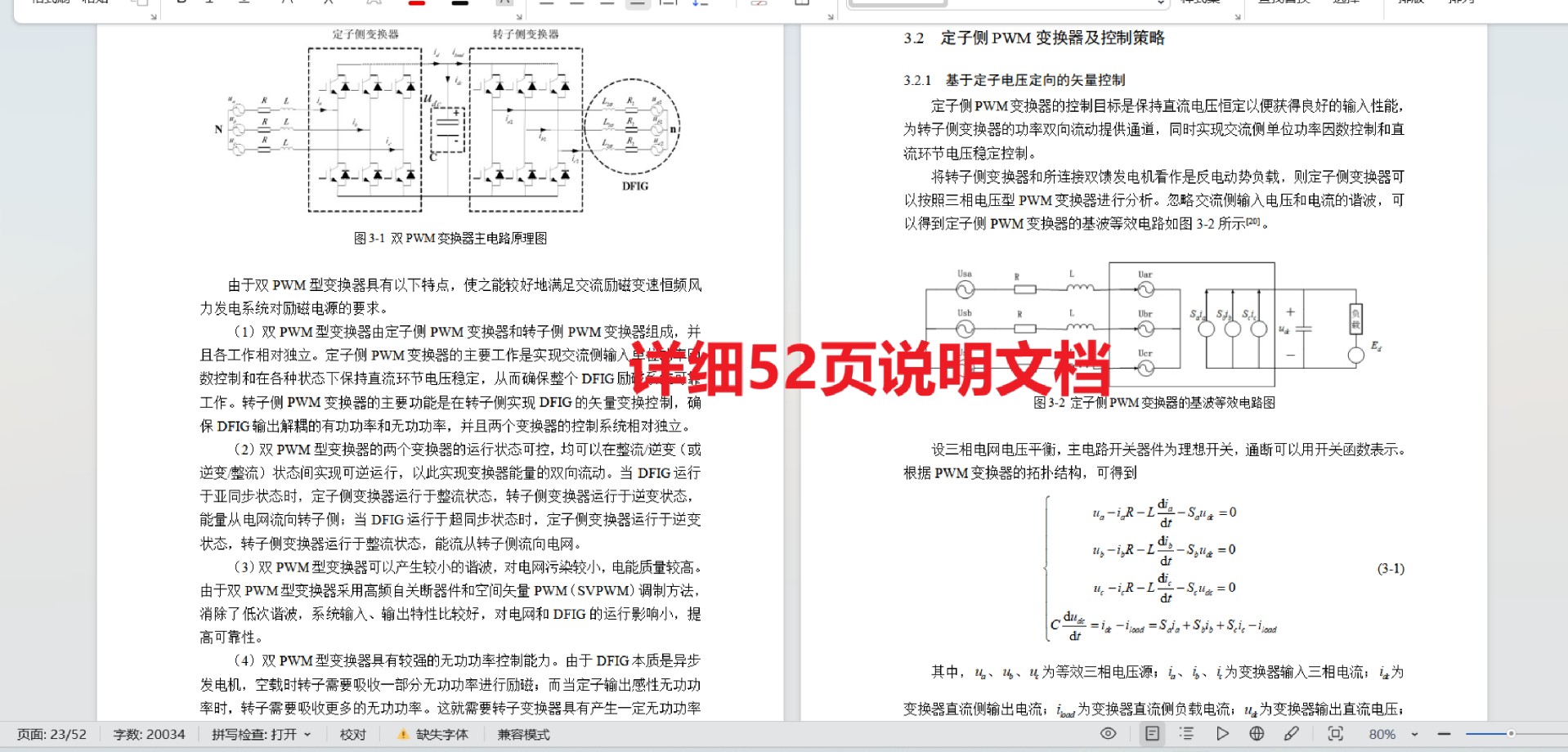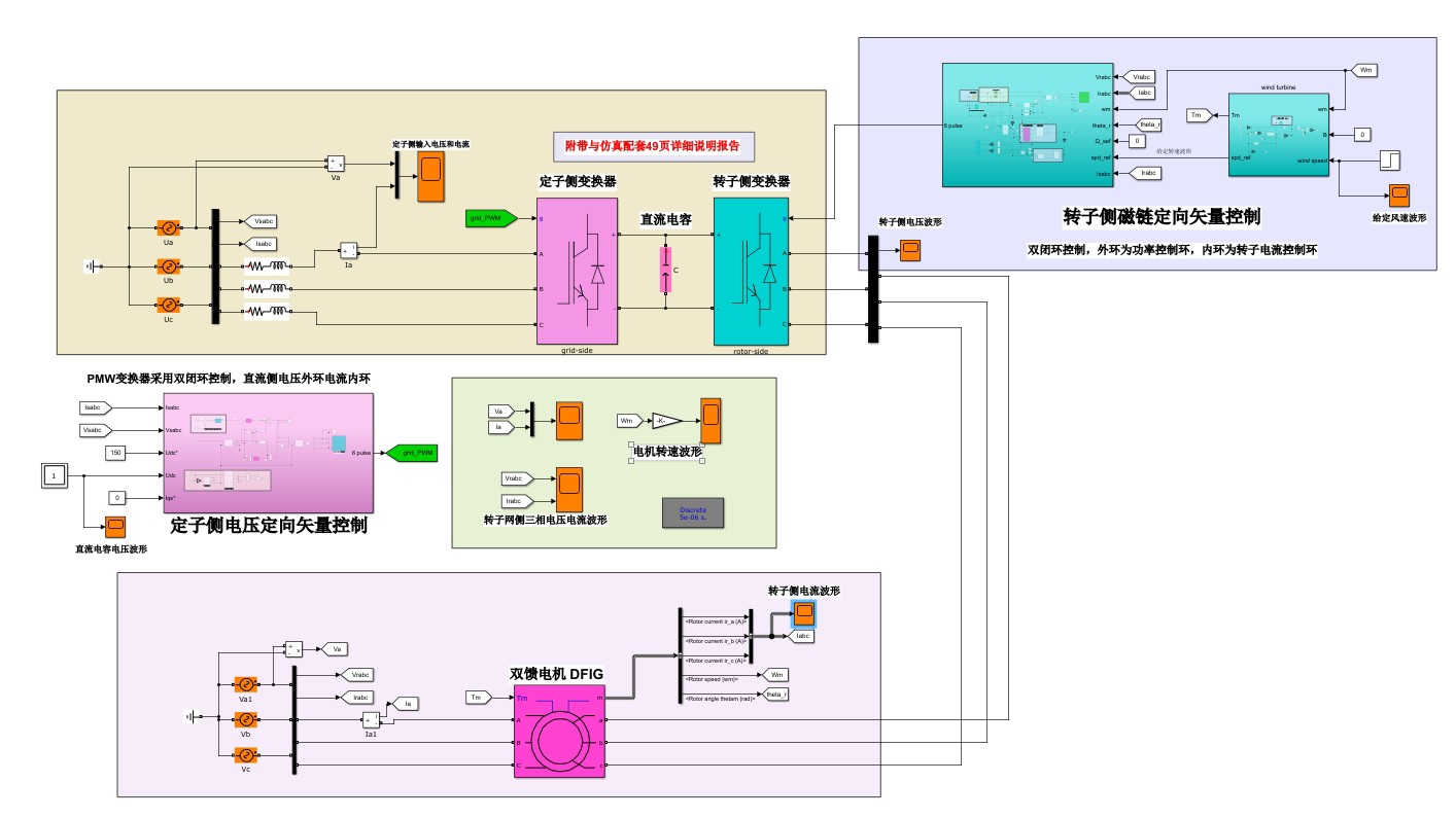 双馈风力发电机PWM变流器矢量控制Matlab仿真模型 附带一份Word说明文档! ! ! [1]定子侧变流器控制策略--定子电压定向矢量控制定子侧变流器采用电压外环,电流内环的双闭环控制,描述:电压外环控制直流母线电压,直流电压给定值与反馈值的偏差经过调节器,其结果决定有功功率大小,符号决定有功功率的方向。 电流内环按照电压外环输出的电流指令进行电流控制,实现单位功率因素运行。 [2]转子侧变流器控制策略--磁场定向矢量控制 描述:转子侧变流器同样为双闭环控制,外环为功率环,根据有功功率、无功功率的给定,经过调节器结合当前风速和对应的叶尖速比得出给定的转速;内环为转自电流控制环,电流经调节器后输出电压控制量,再经过空间电压矢量脉宽SVPWM调制后产生触发脉冲控制变流器。