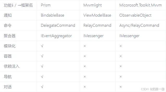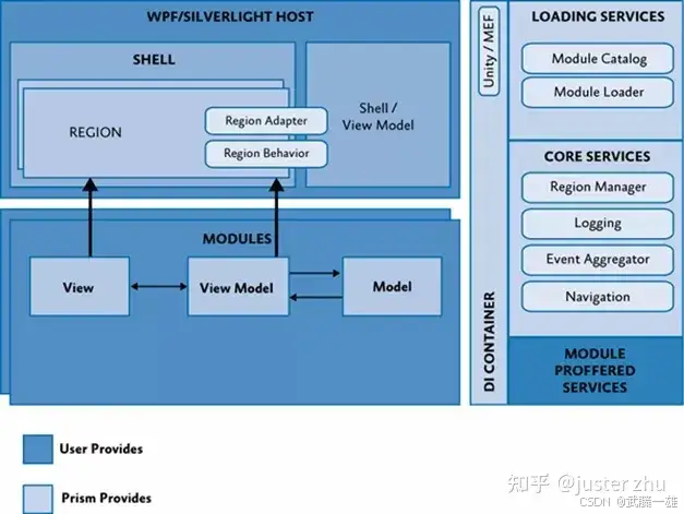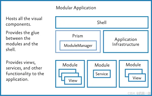 - Prism.WPF 是建立在 Prism.Core 之上的。Prism.Core 提供通用的接口和抽象(例如 IRegionManager 的接口、DelegateCommand、EventAggregator),而 Prism.WPF 则提供这些接口在 WPF 环境下的具体实现。