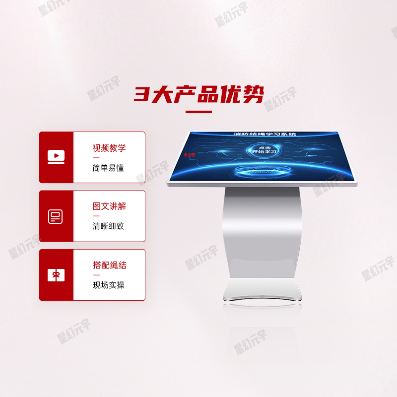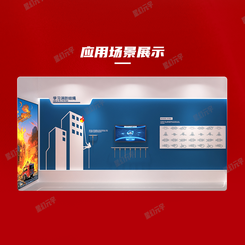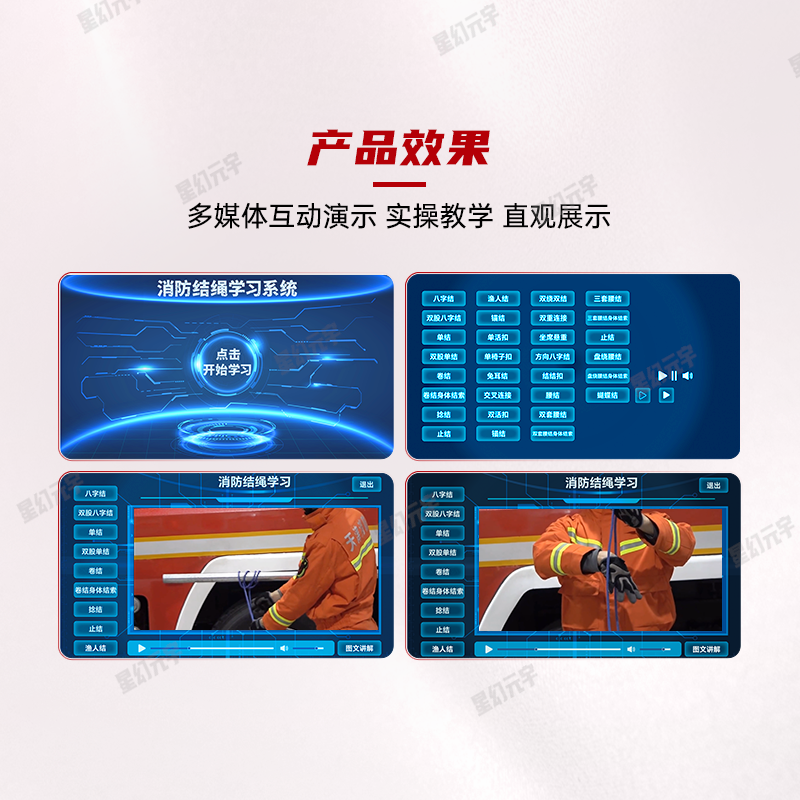 先通过VR全景动画展示火灾、地震等灾害中结绳自救的典型案例,凸显结绳技术的应急价值,随后跳转至触摸一体机的教学资源库。资源库收录24种消防自救结绳打法,每种打法均配套高清步骤视频、关键节点标注图片及详细文字解读,视频动态呈现绳索缠绕、收紧的完整流程,图片标注绳结成型关键位置,文字则同步说明该绳结的适用场景、承重能力及使用禁忌,让学习者明晰"怎么打"和"何时用"。