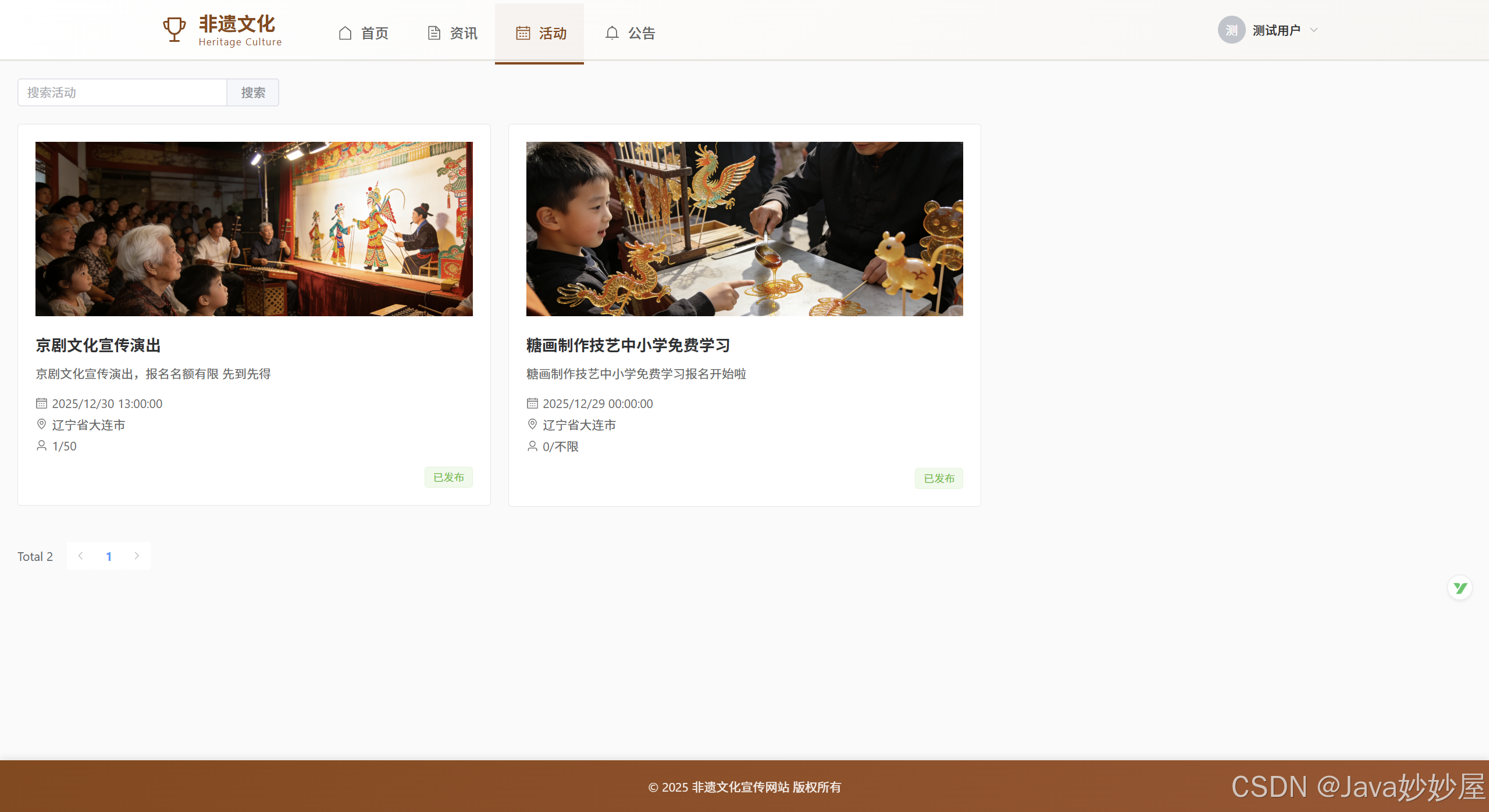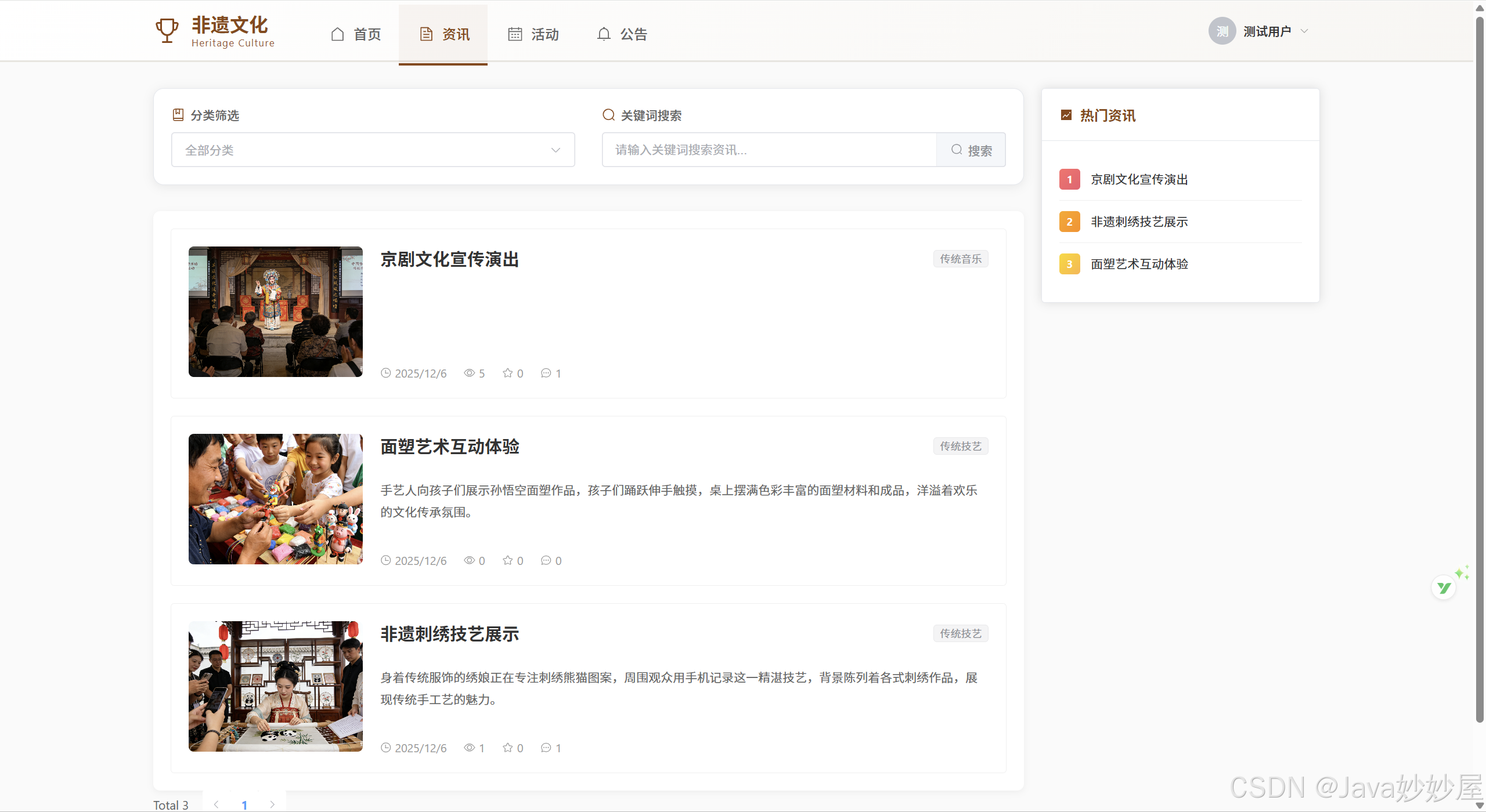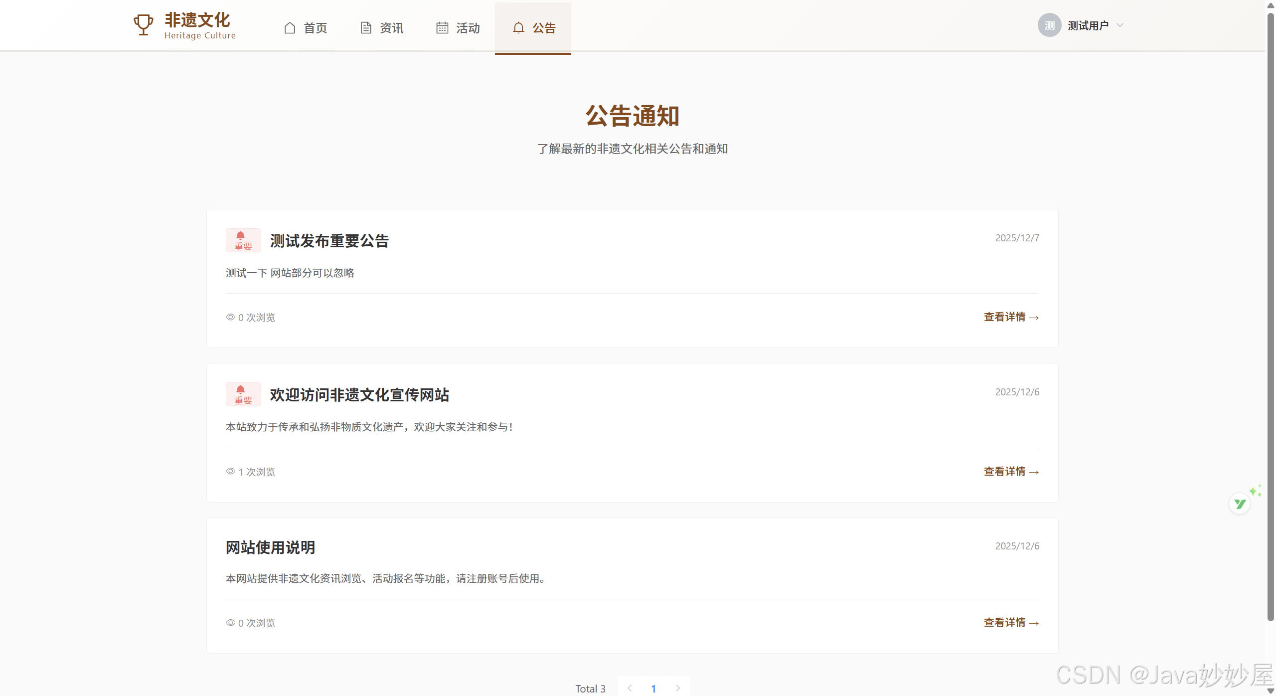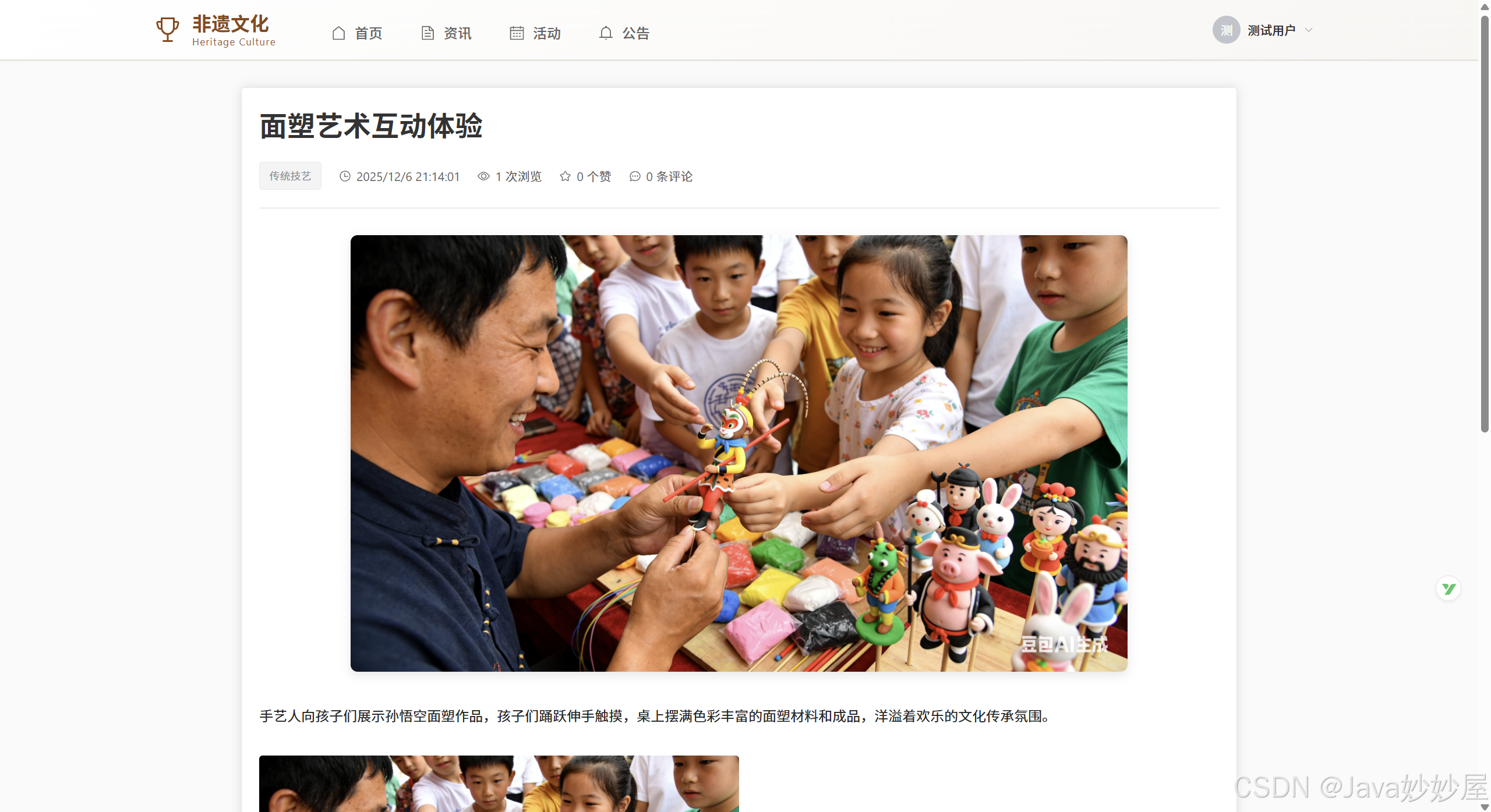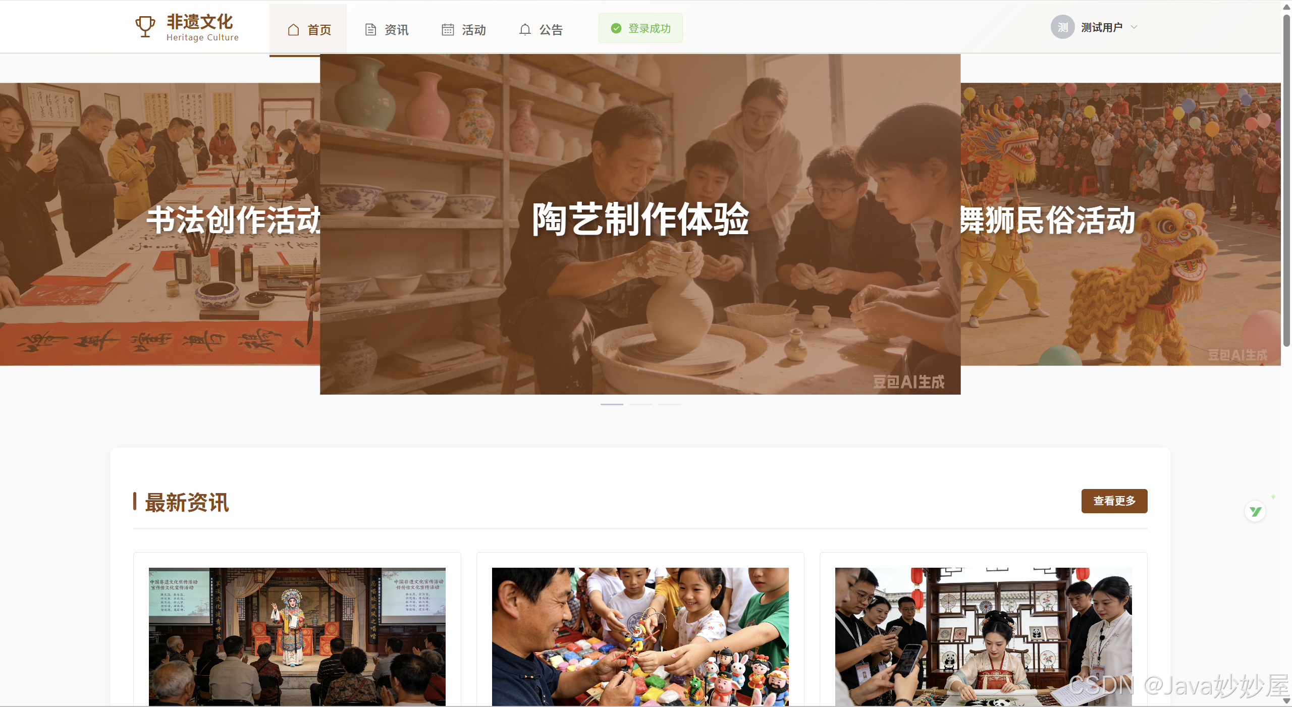 基于Spring Boot 3.1.5 + MyBatis-Plus 3.5.8 + Vue3 + Element-Plus + MySQL 开发的非遗文化宣传网站。