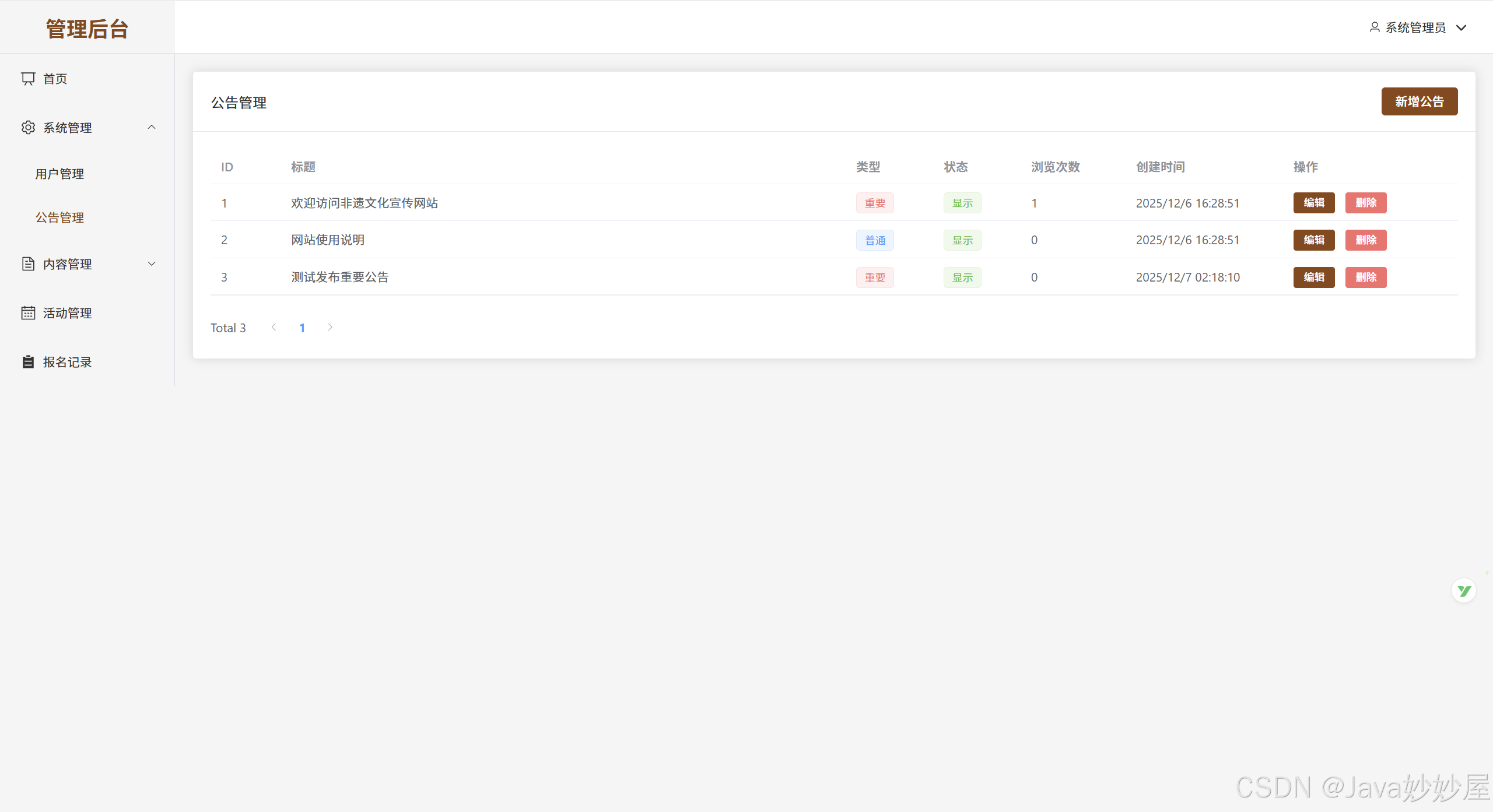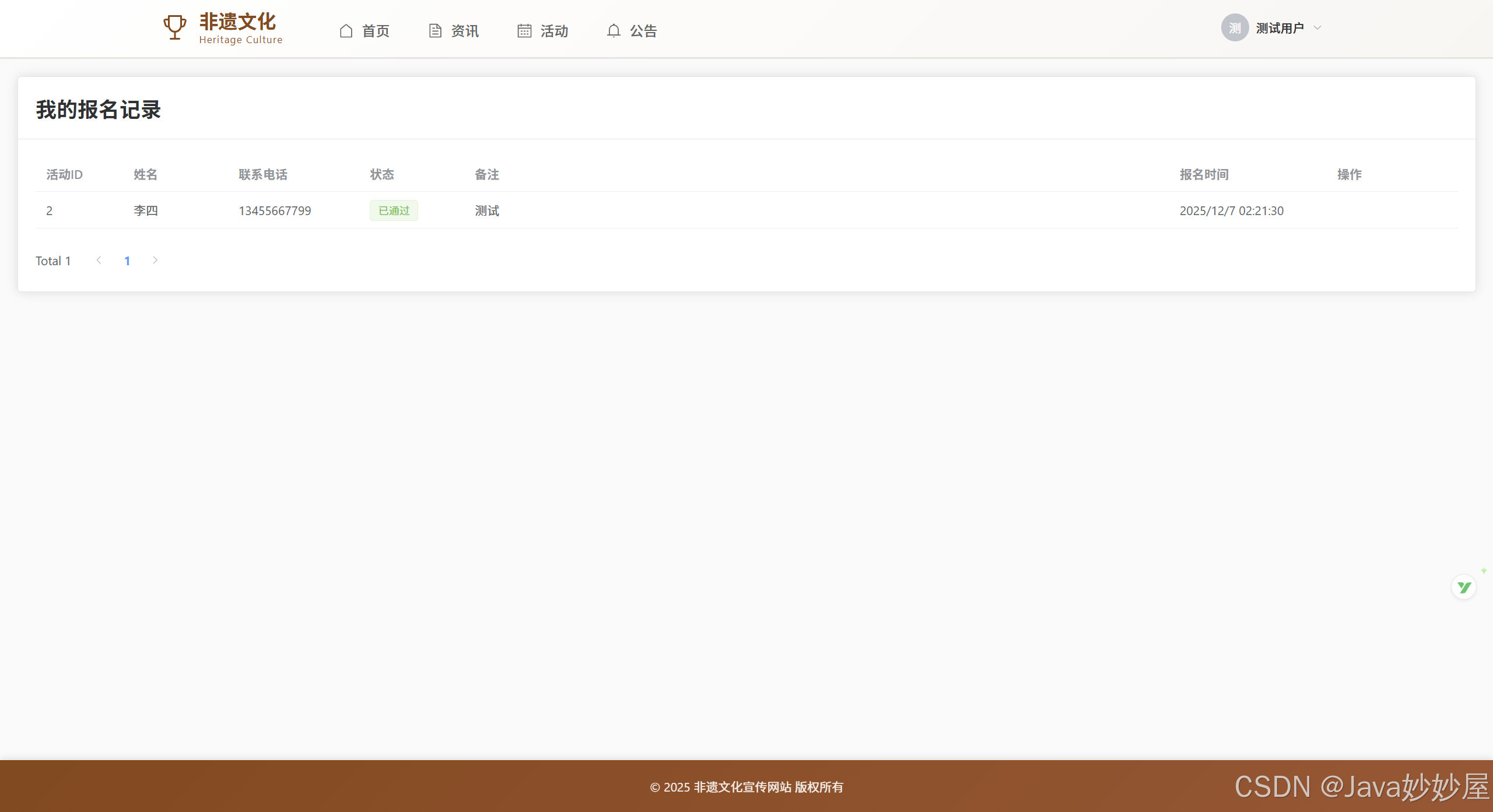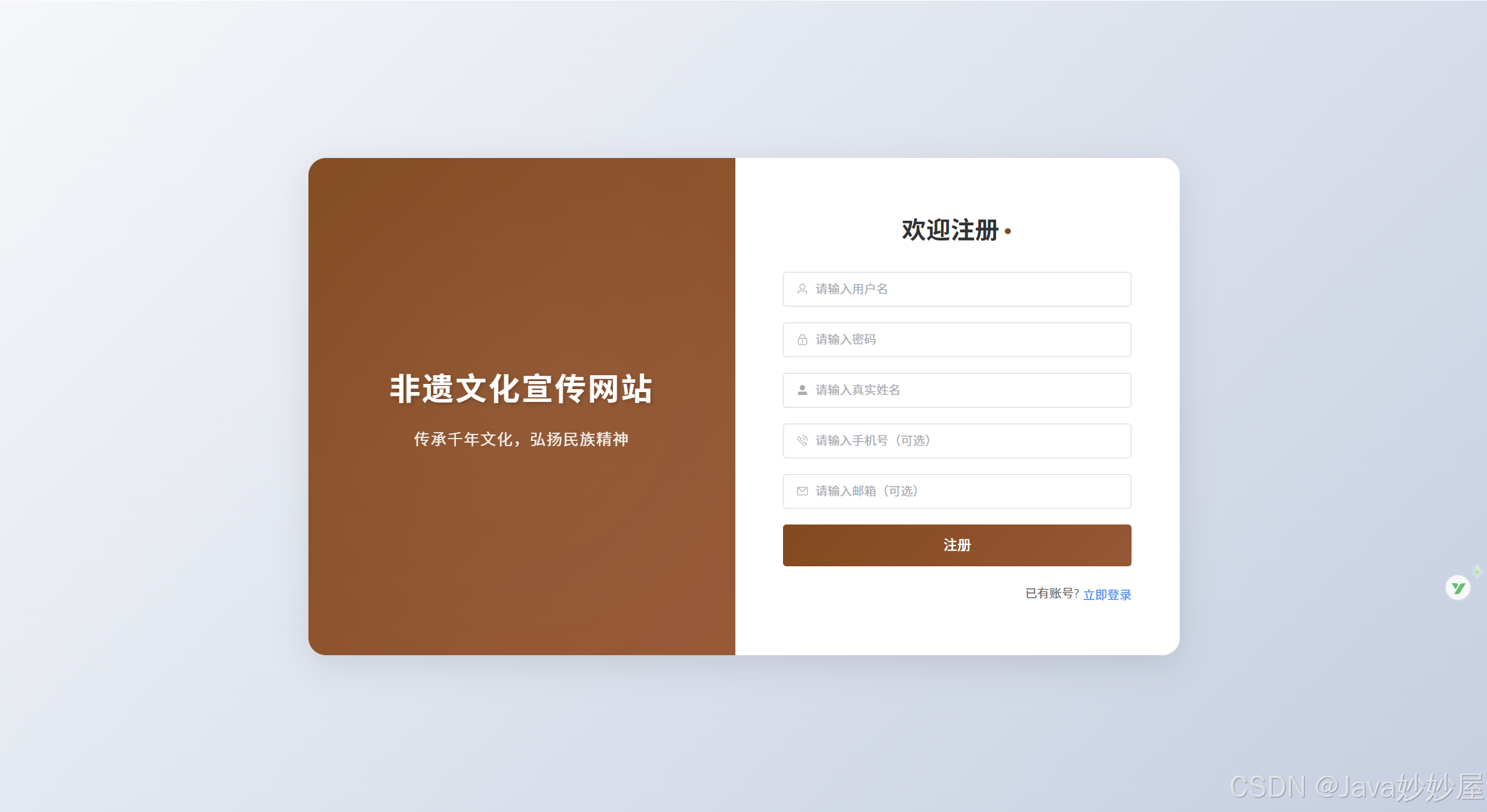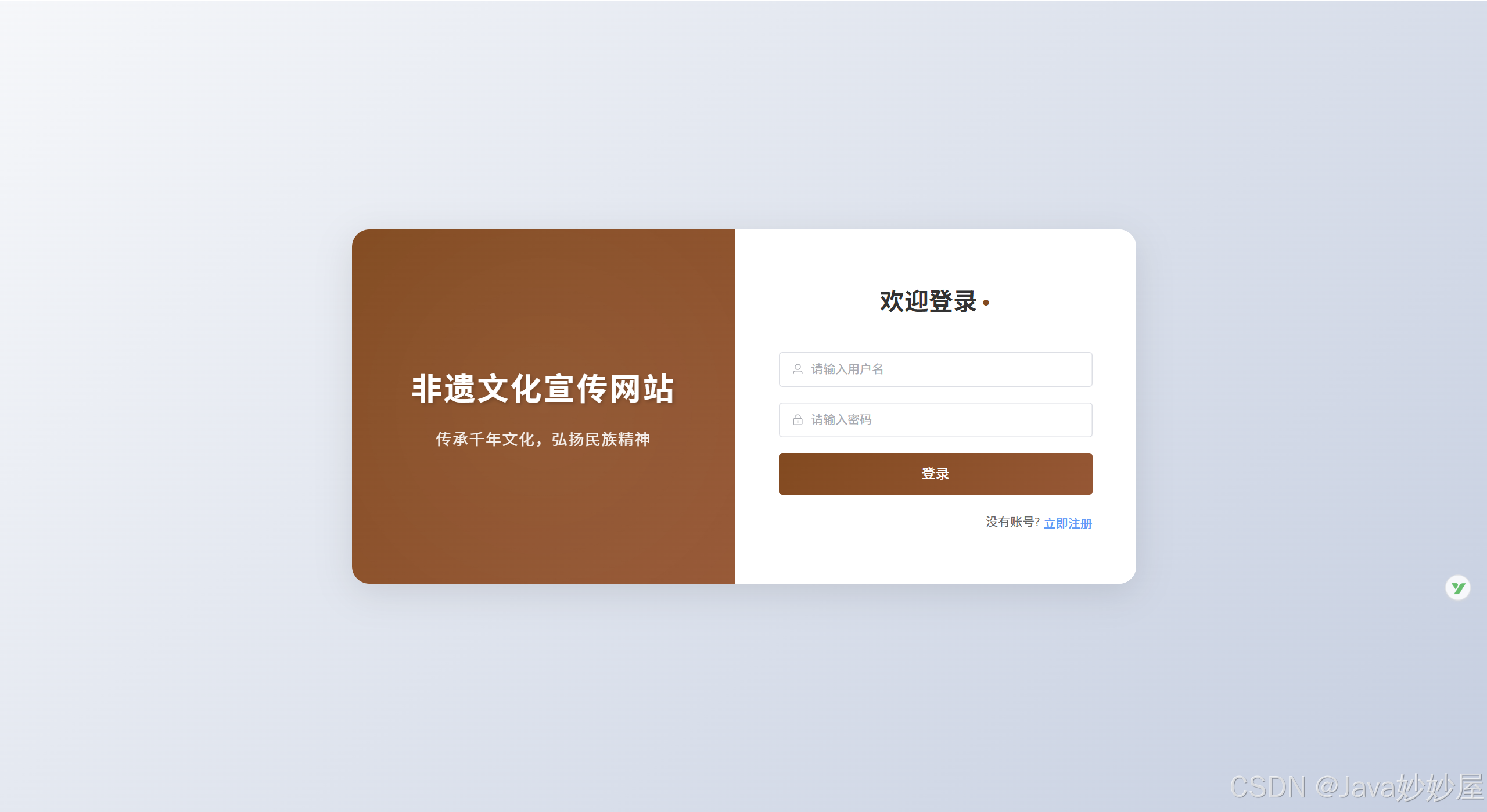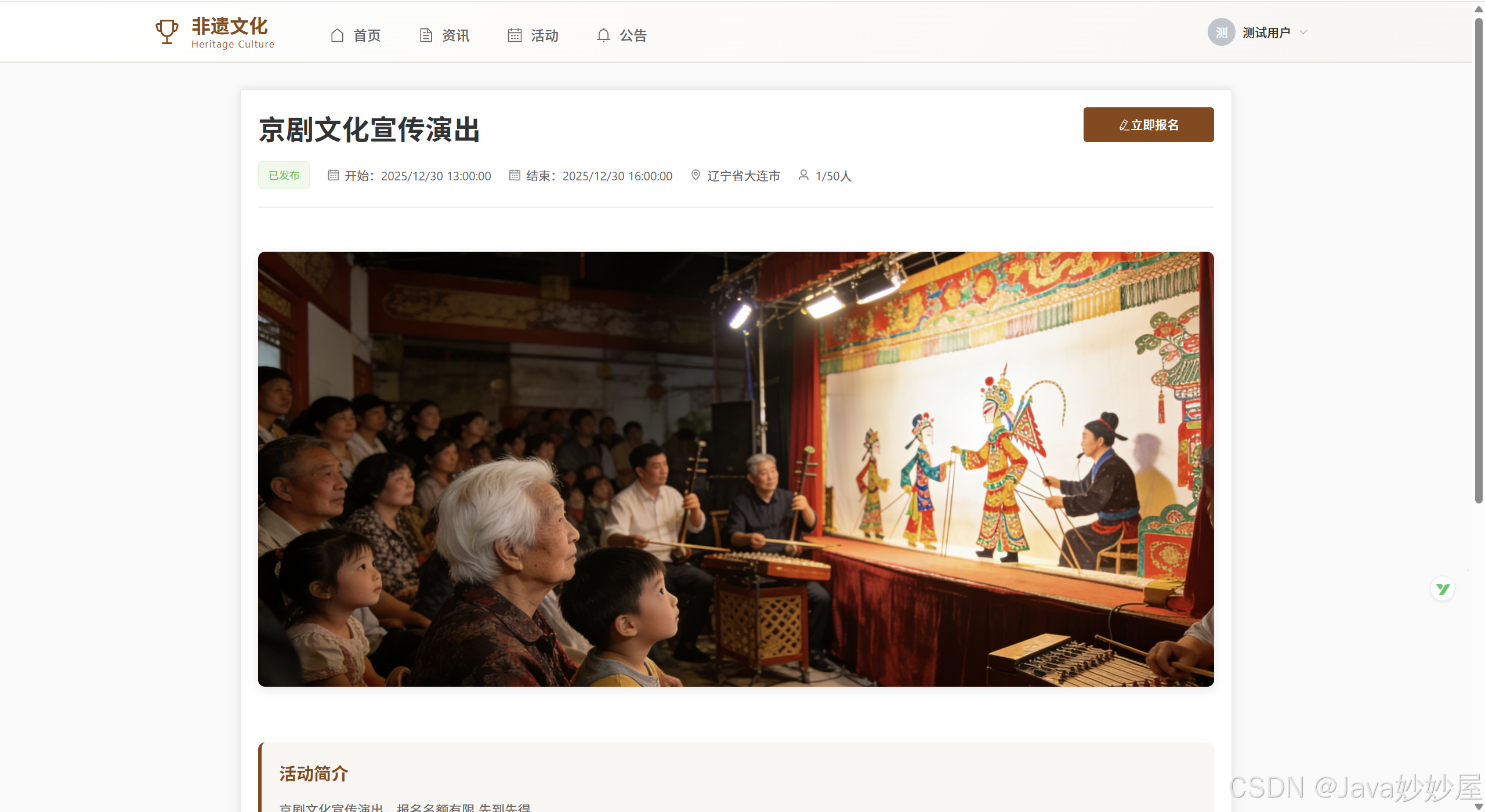基于Spring Boot 3.1.5 + MyBatis-Plus 3.5.8 + Vue3 + Element-Plus + MySQL 开发的非遗文化宣传网站。