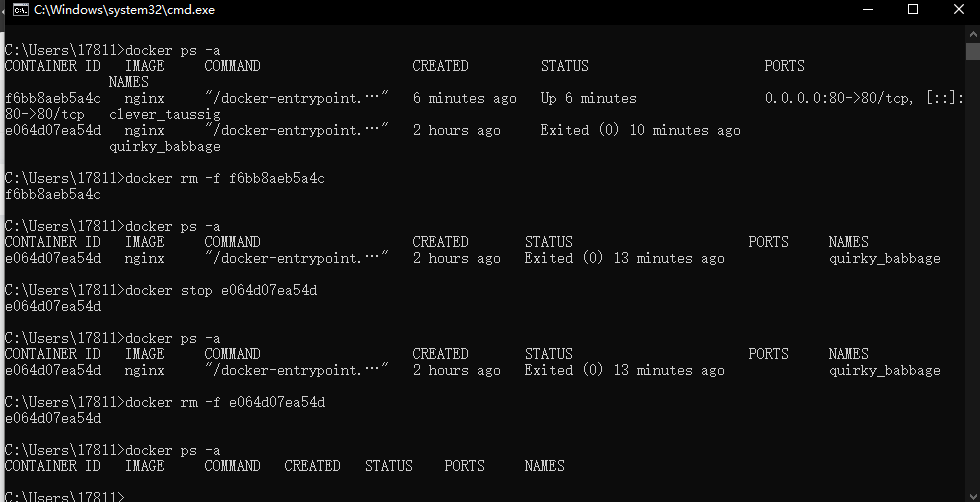 docker rm -f f6bb8aeb5a4c (rm删除容器,-f强制删除)