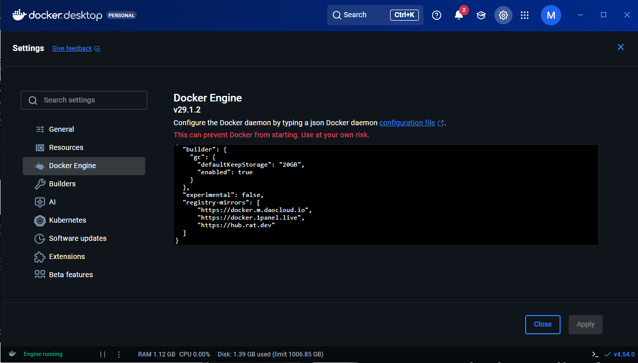 打开docker,设置->docker engine->在flase后加上"," 并输入: