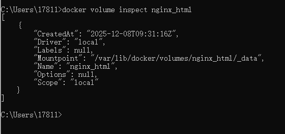 docker volume inspect nginx_html(查看挂在卷所在目录)