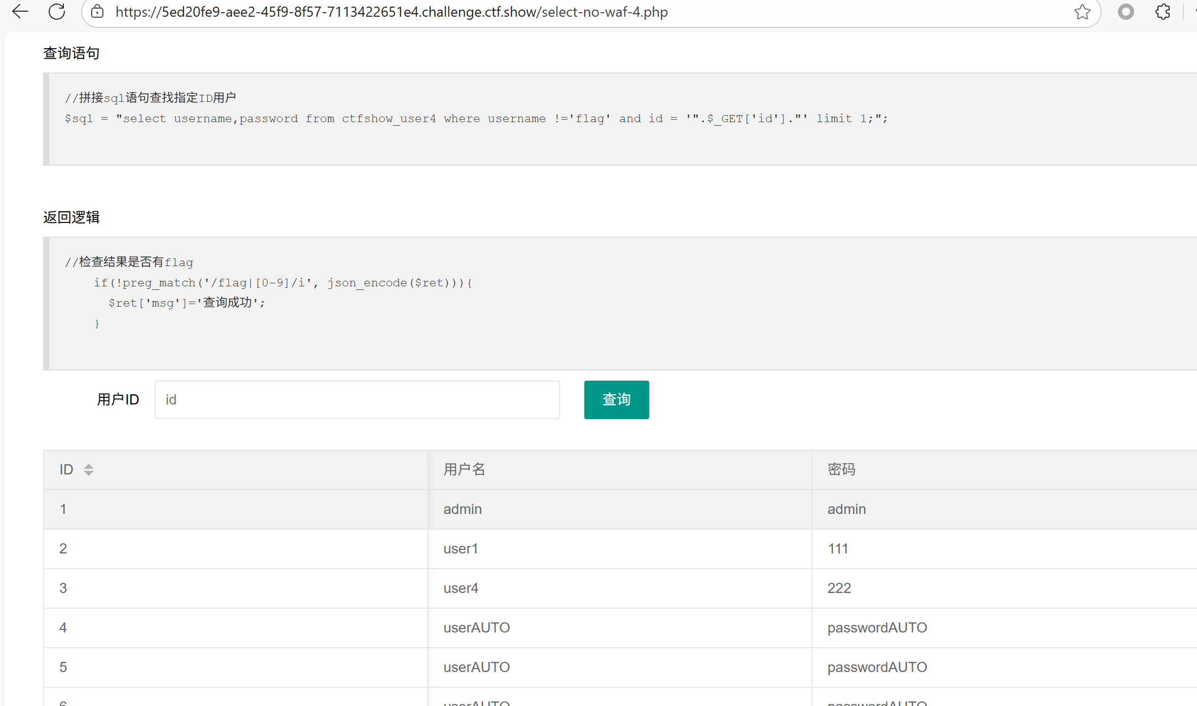 url = "http://f588acf7-442b-4627-ac25-ce9239e694cf.challenge.ctf.show//api/v4.php?id=1' and "