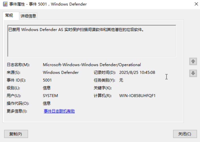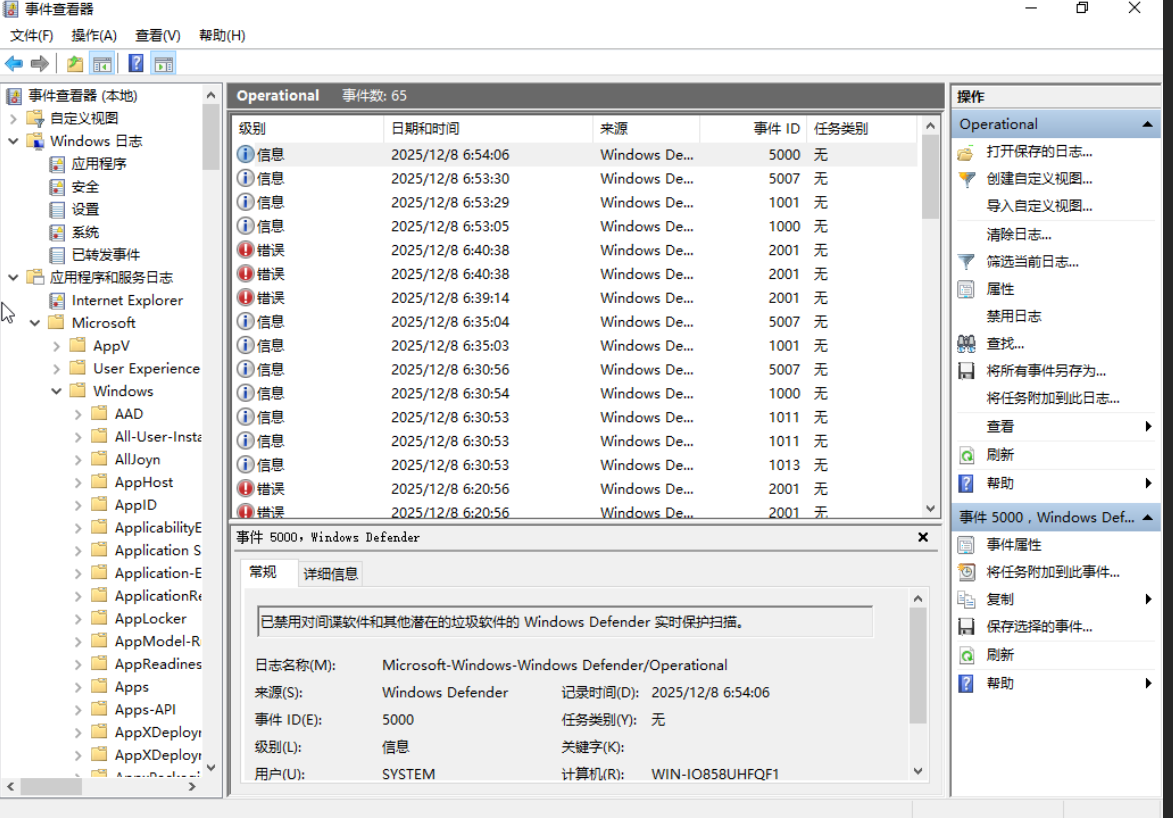 - 事件管理器,应用程序和服务日志 → Microsoft → Windows → Windows Defender → Operational,查看5001事件