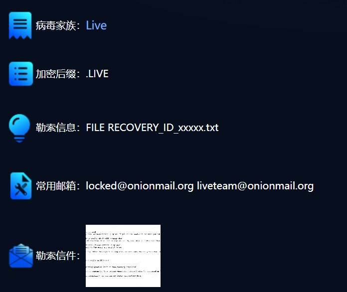 在勒索病毒搜索引擎网站搜索 LIVE 关键字,成功得到病毒家族信息