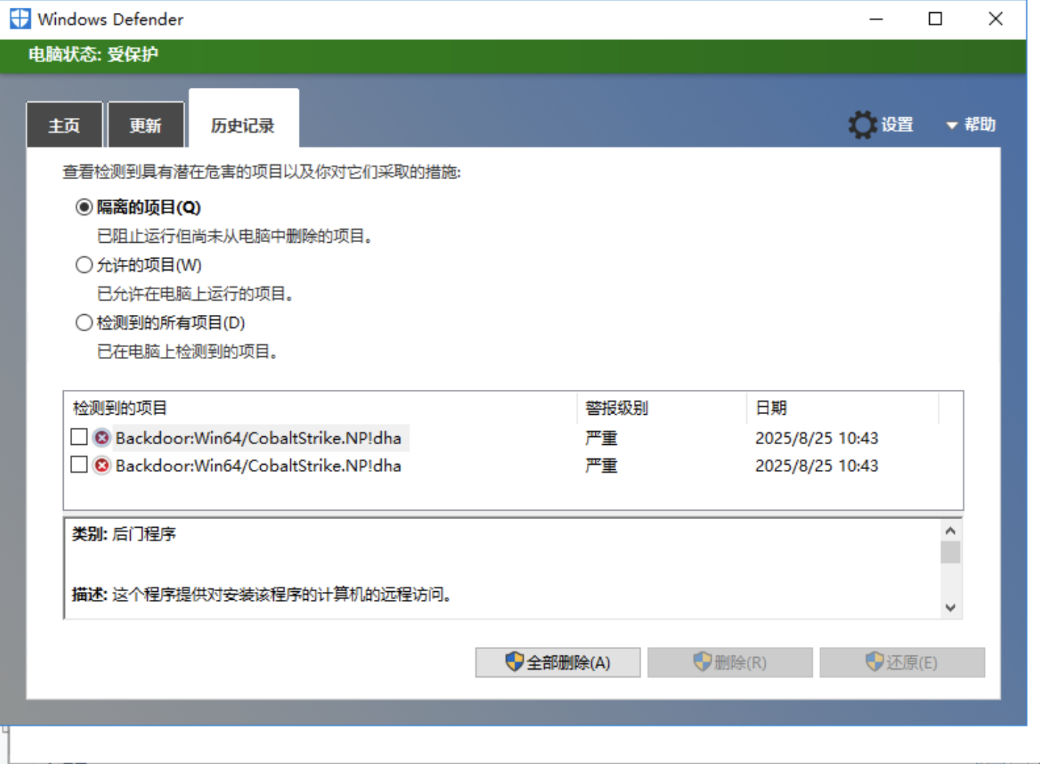 提交Windows Defender删除攻击者C2的时间,以flag{2025.1.1_1:10}格式提交