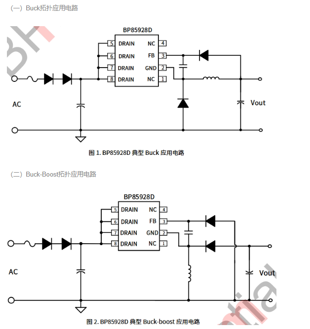 小家电辅助电源 架构:AC→整流滤波→BP85928D(Buck)→5V 输出功能:为 MCU、按键、显示、传感器与通信模块供电要点:固定 5V 输出,保护齐全,待机功耗低器件:整流桥、滤波电容、续流二极管、反馈分压电阻、输出电容