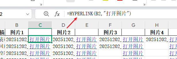 公式运行后,C 列单元格会显示 "打开图片",点击就能直接打开 B 列对应的文件。