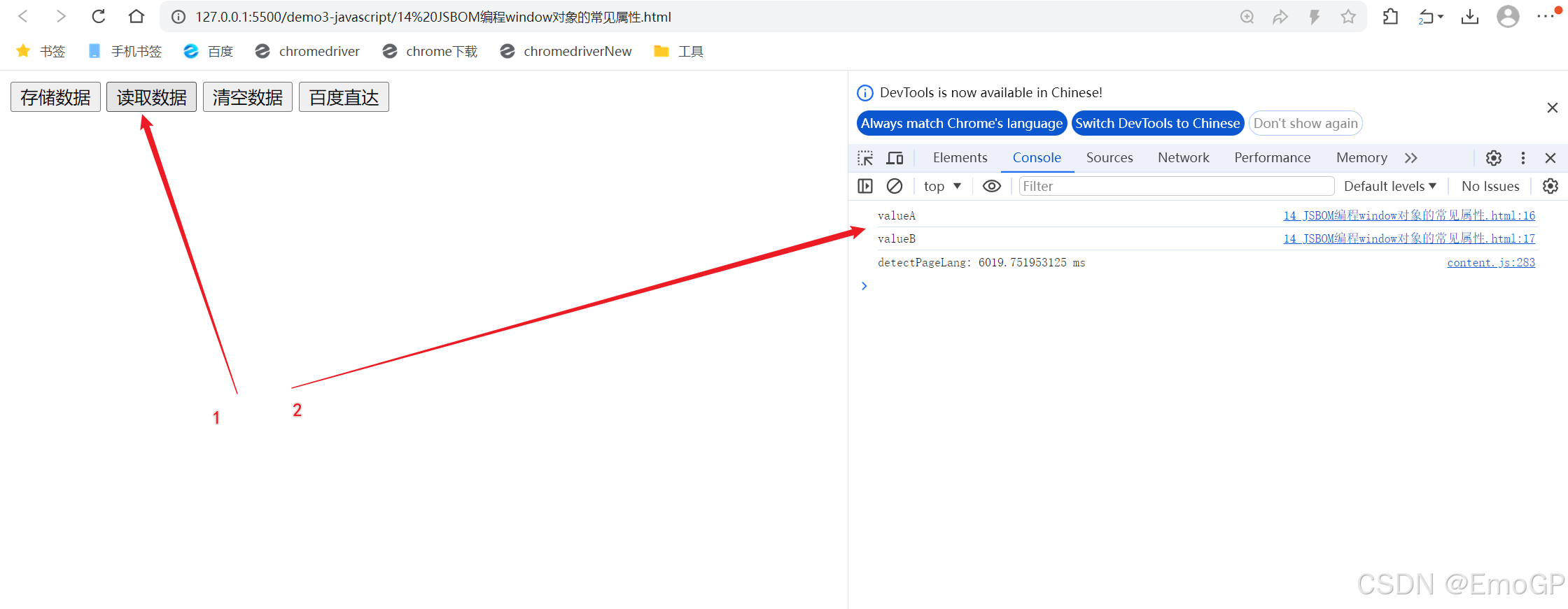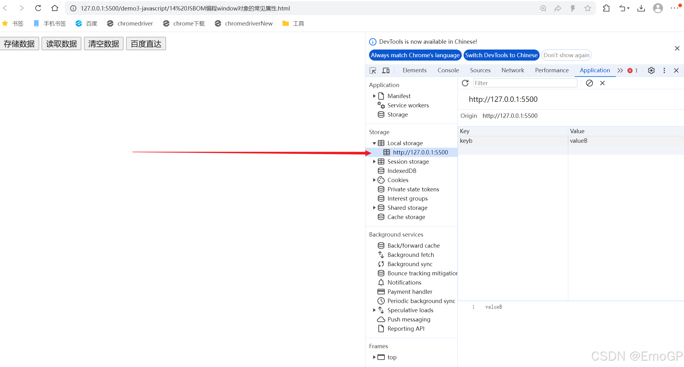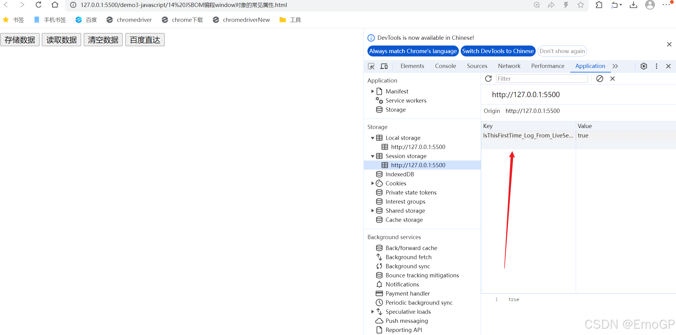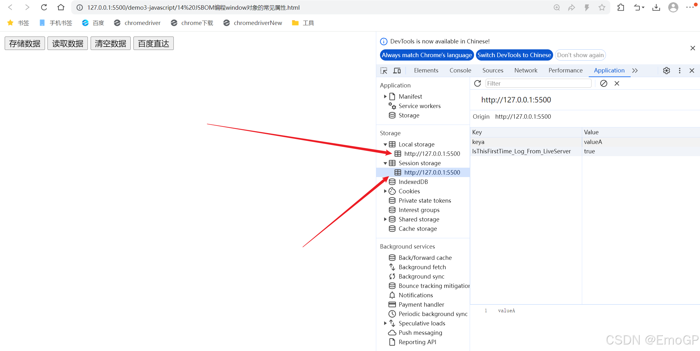 关闭会话后再次打开,可以看到Local Storage中数据还在,但是Session Storage中已经没有了数据
