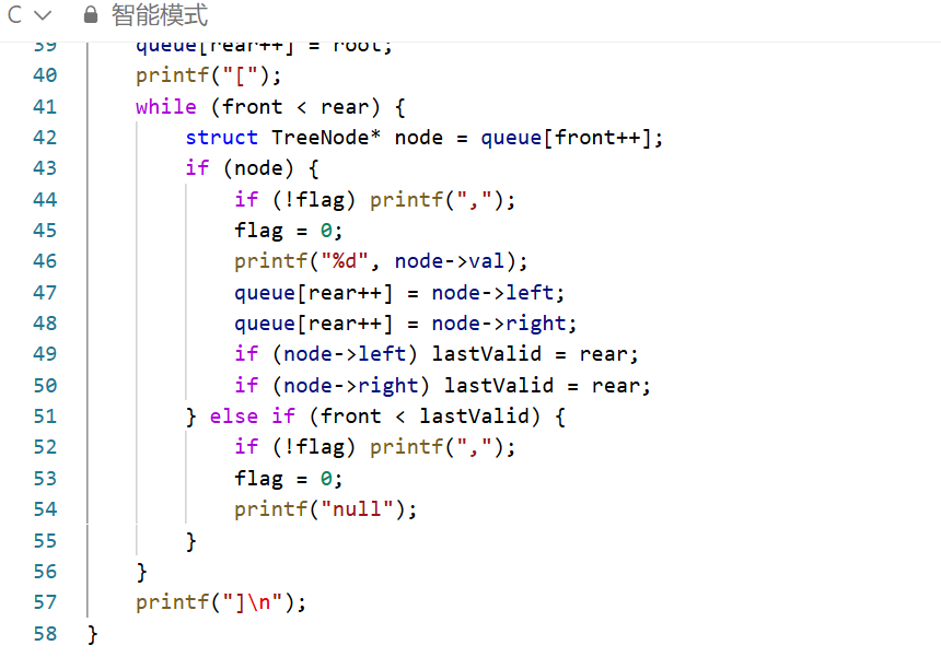 输出适配性好:配套的打印函数自动过滤层序遍历末尾的多余 null,输出格式与题目示例完全一致,无需额外调整。