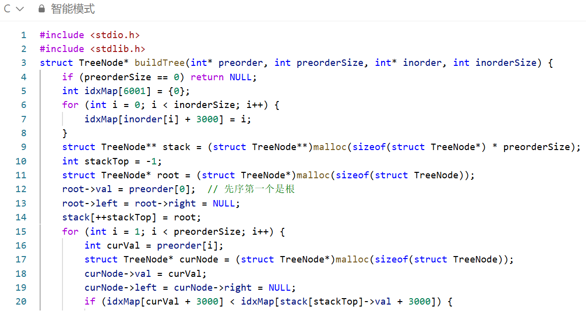 逻辑极简易理解:核心逻辑浓缩在一个循环内,无需拆分先序 / 中序的左右子树范围、传递复杂的递归参数;仅通过中序索引大小即可判断节点是左 / 右子节点,直观且不易出错,代码量仅 30 行核心逻辑。