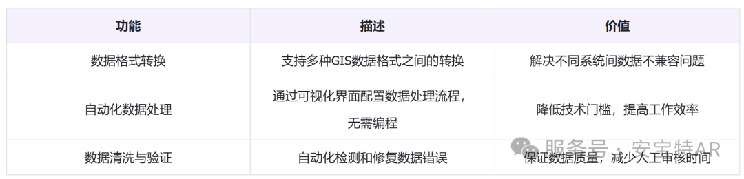 安宝特FME是一款专注于GIS数据类型处理的自动化数据集成平台 , 在GIS数据处理领域具有独特优势。该软件主要聚焦于解决数据清洗、转换和集成过程中的效率问题,特别适用于需要处理复杂地理空间数据的企业和组织。