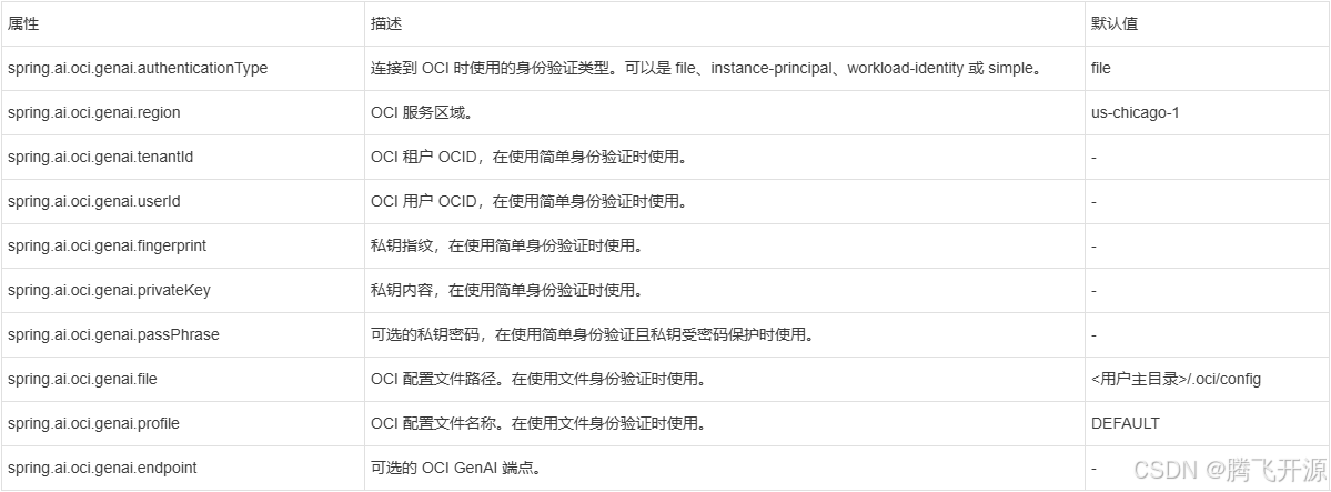 前缀 spring.ai.oci.genai 是用于配置连接到 OCI GenAI 的属性前缀。