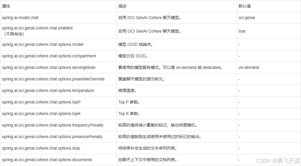 前缀 spring.ai.oci.genai.cohere.chat 是用于配置 OCI GenAI Cohere 聊天模型实现的属性前缀。
