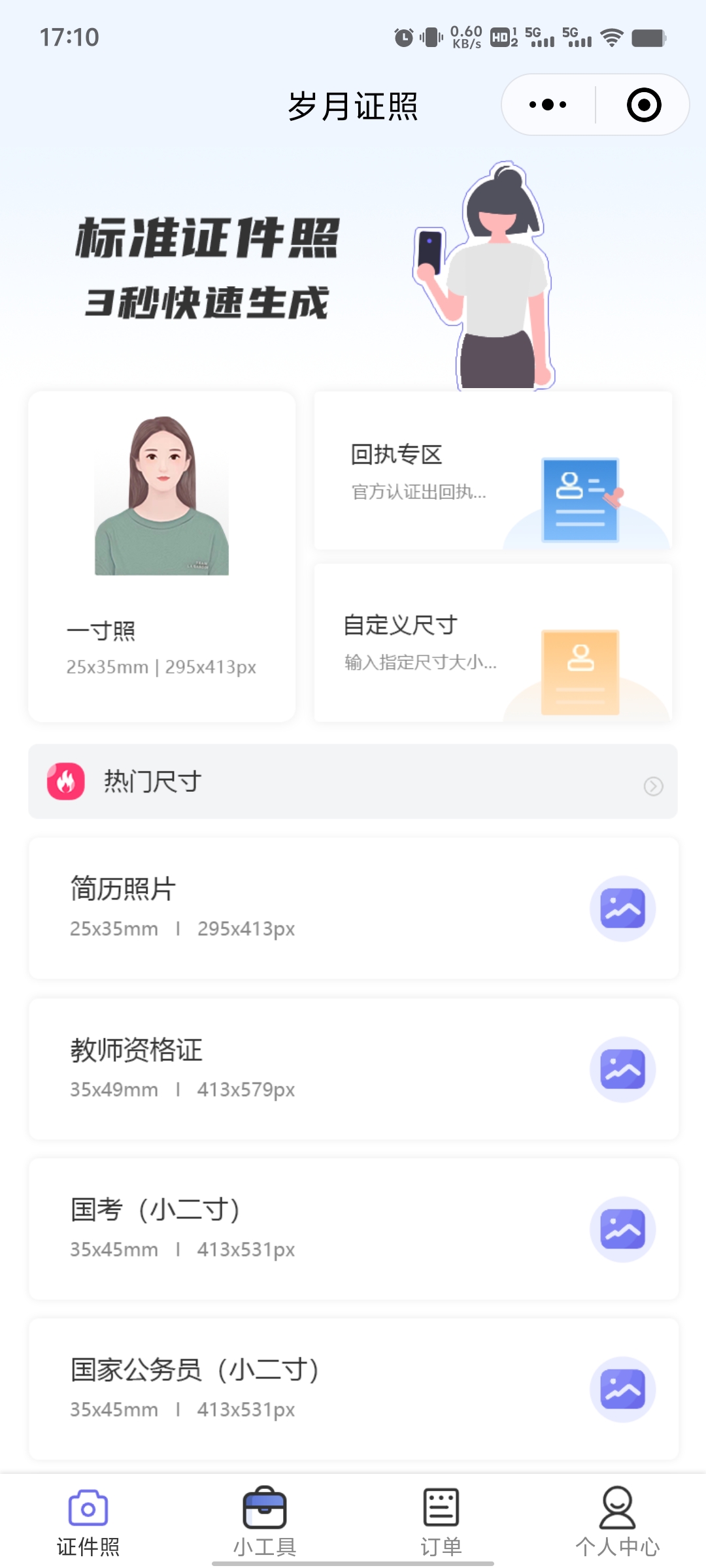 "岁月证照"小程序支持超过110种证件类型,从一寸、二寸的标准证件照,到护照、简历照、准考证照、驾驶证等,几乎涵盖了所有日常办证件的需求。无论你是学生、职场人士还是旅行爱好者,都能在这里找到适合你的证件照规格。