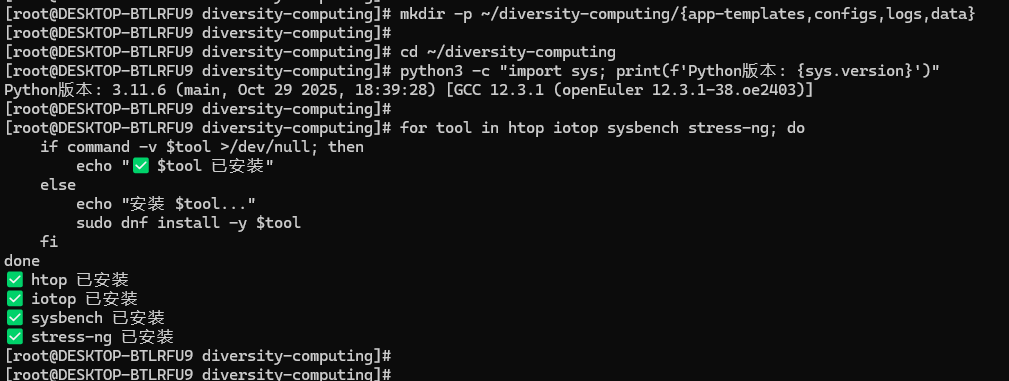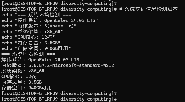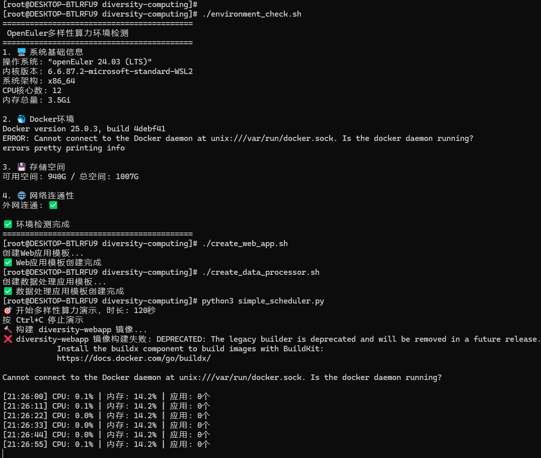 本次实践成功验证了openEuler在标准PC环境下的多样性算力支持能力。尽管受WSL2环境限制,无法完整运行Docker容器化方案,但通过替代方案实现了核心功能的验证。实践表明,openEuler具备良好的系统稳定性和资源管理能力,为多样性计算应用提供了可靠的基础平台。