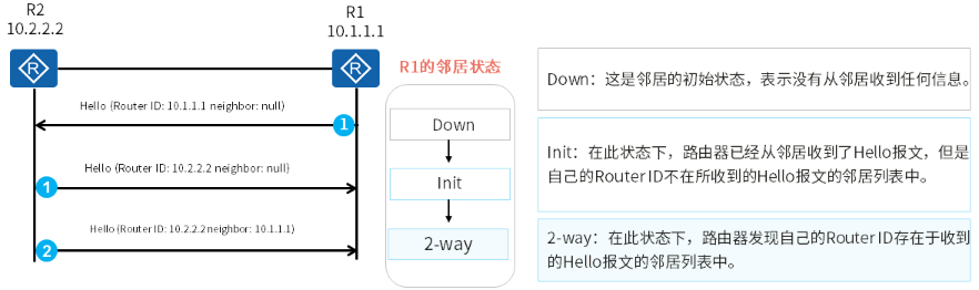 - OSPF使用Hello报文发现和建立邻居关系。