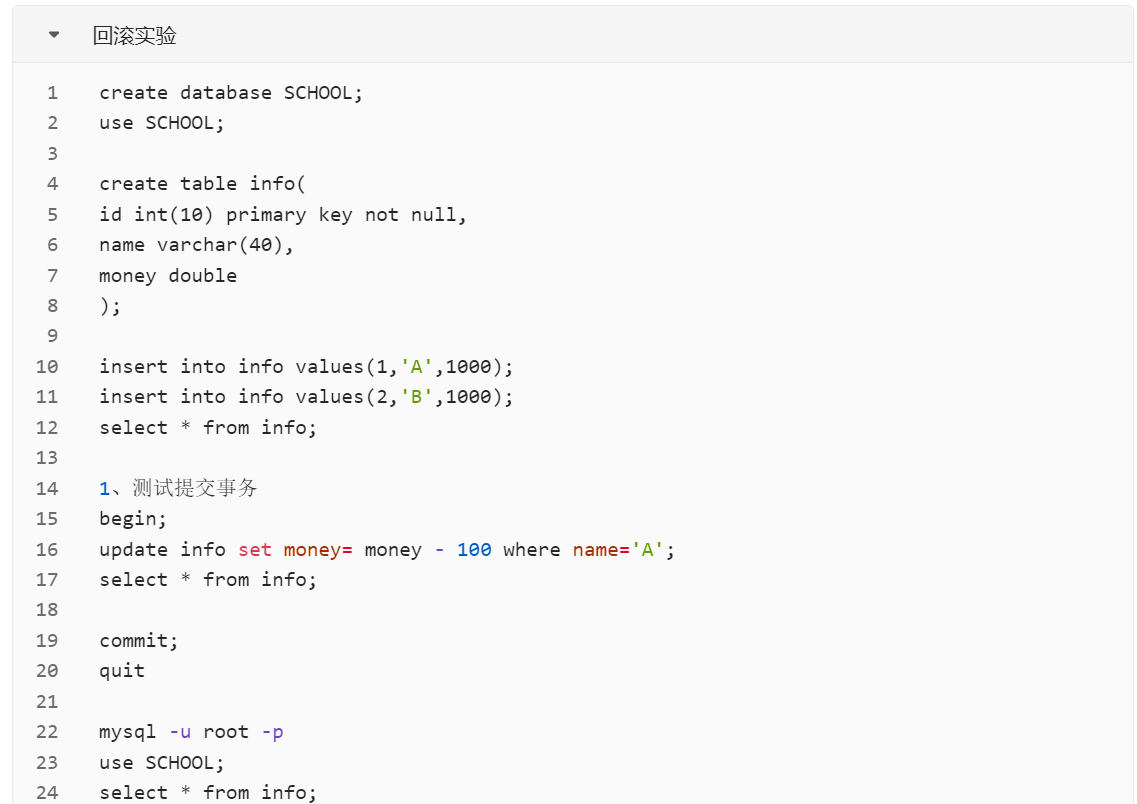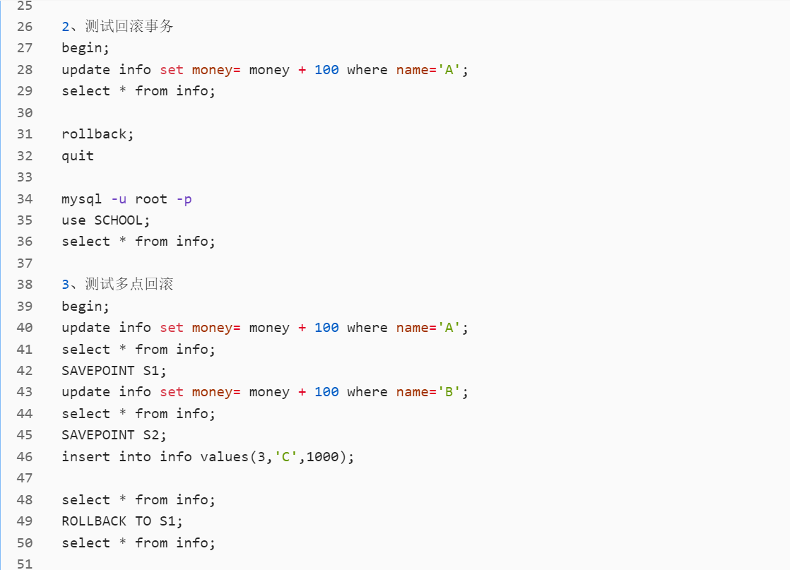 - SAVEPOINT S1:使用 SAVEPOINT 允许在事务中创建一个回滚点,一个事务中可以有多个SAVEPOINT;"S1"代表回滚点名称。