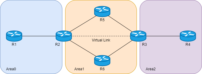 Virtual Link 是一种虚拟的、逻辑的链路,部署在两台 OSPF 路由器之间,和 Area0 非直连的骨干区域,穿过中间的非骨干区域,实现和 Area0 的连接。当两台路由器穿过一个非骨干区域,建立虚链路后,这两台路由器就尝试建立邻接关系,当基于 Virtual Link 的邻接关系建立起来后,路由器会生成 Type-1 LSA 描述这条 Virtual Link 。另外,Virtual Link 不能部署在 Stub 区域内。