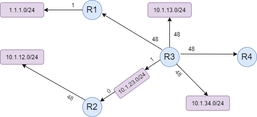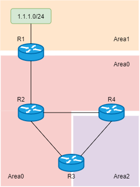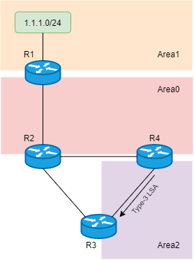 这个网络中,Area2 并没有和 Area0 直连,那么 R3 并不是 ABR ,也无法向 Area1 通告 Area2 内的网段路由,也就是 Area2 无法向 Area1 通告 Type-3 LSA 。当然,也无法向 Area2 内通告到达 Area0 和 Area1 内的网段路由。于是,Area2 就成了一座孤岛。