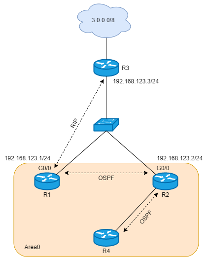 OSPF 定义了专门的命令,把默认路由引入 OSPF 。比如在 R0 上,配置如下: