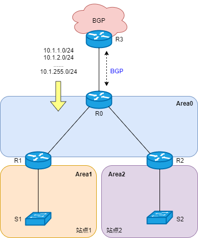 为了让路由汇总更可控,OSPF 需要手动实施,不支持路由自动汇总。OSPF 有两种路由汇总方法,一种是部署在 ABR 上,另一种是部署在 ASBR 上。
