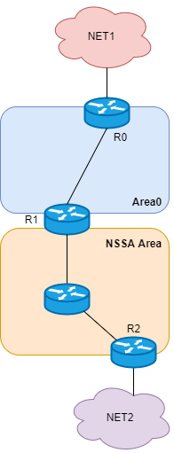 R0 连着外部网络 NET1 ,R0 把到达 NET1 的静态路由引入 OSPF ,这些路由使用 Type-5 LSA 描述,在整个 OSPF 域内泛洪,当 Area1 配置成 NSSA 后,R1 会阻挡 Type-5 LSA 进入 Area1 。同时,R1 会自动下发一条默认路由到 Area1 ,使用 Type-7 LSA 描述。这样,NSSA 内的路由器的路由表规模减小,还能通过默认路由到达 NET1 。这条 Type-7 LSA 的默认路由,只能在 NSSA 内传递。