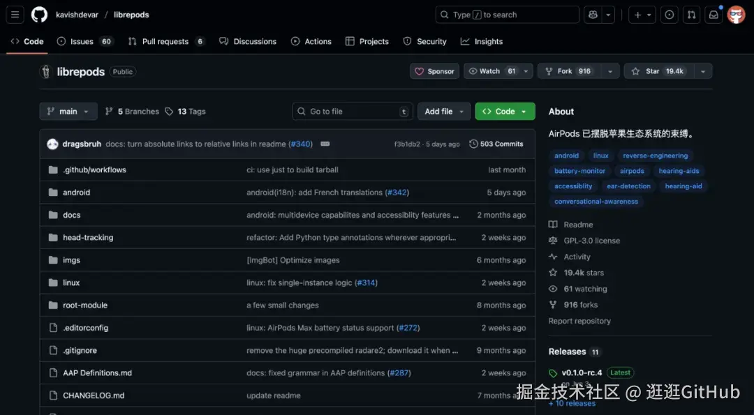 如果你用安卓,而且有 AirPods Pro/Max 耳机,可以试试下面步骤。去 GitHub 项目主页。