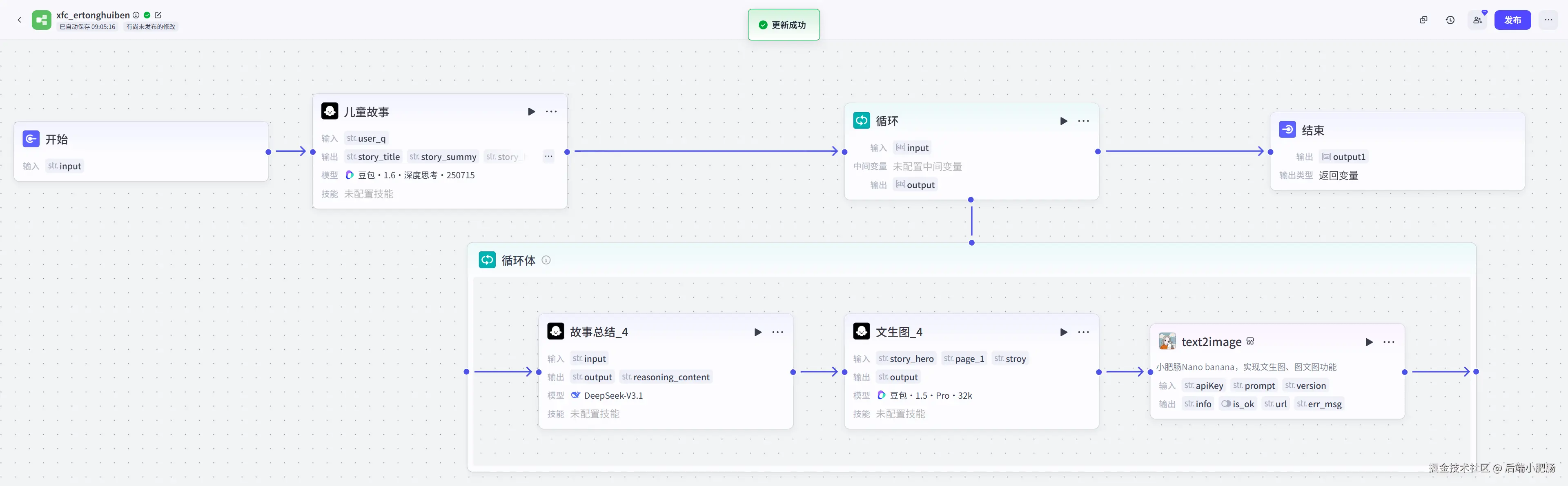 至此,一套完整的儿童绘本自动化工作流就搭建完成了。回顾一下,我们利用 Coze 强大的逻辑编排能力,结合 Nano Banana Pro 插件的高质量生图能力,成功解决了过去绘本制作中角色不一致 和画风难统一的两大痛点。