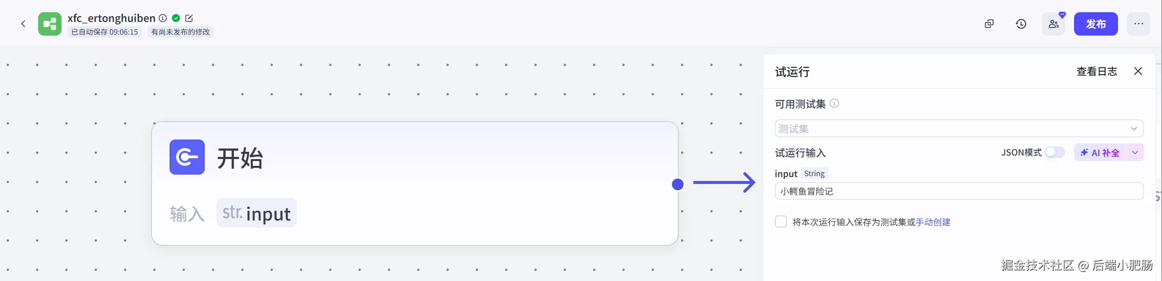 开始节点: 开始节点参数为默认的input字段,接收用户传入的故事主题,我输入的是小鳄鱼的一天。